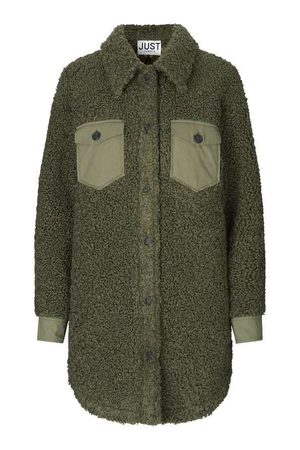 Just Female Cosmo shearling oversized shirt jacket in dark olive green.