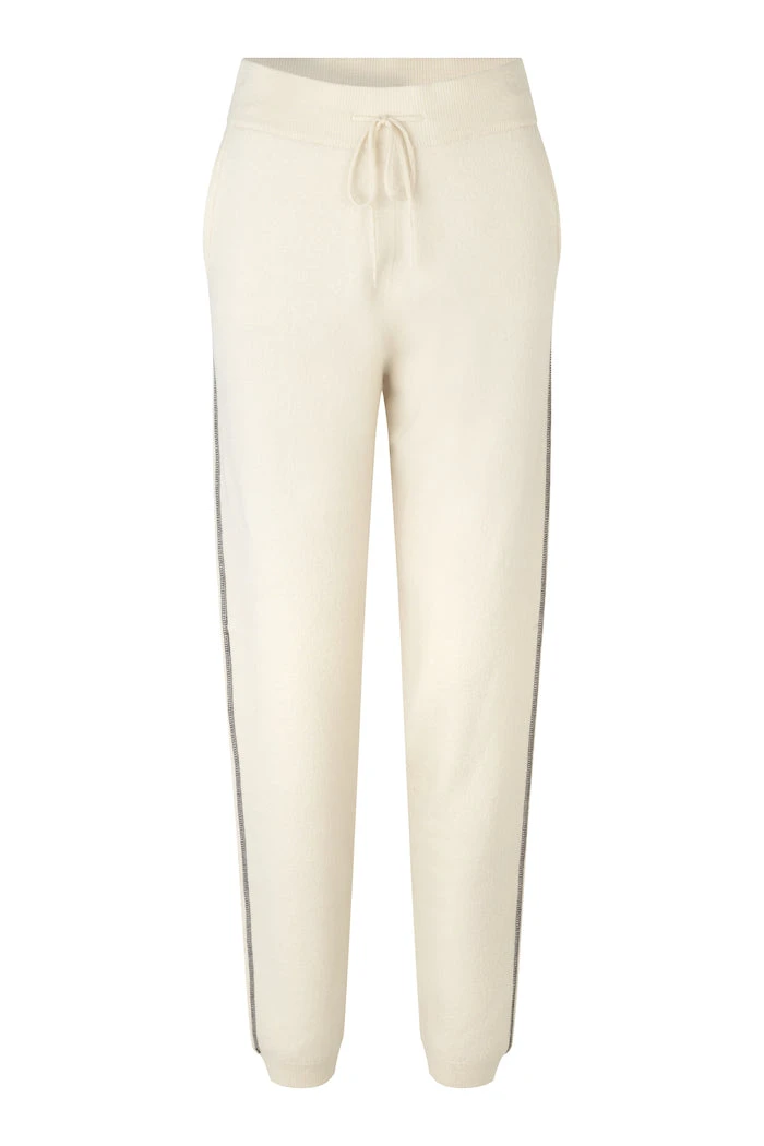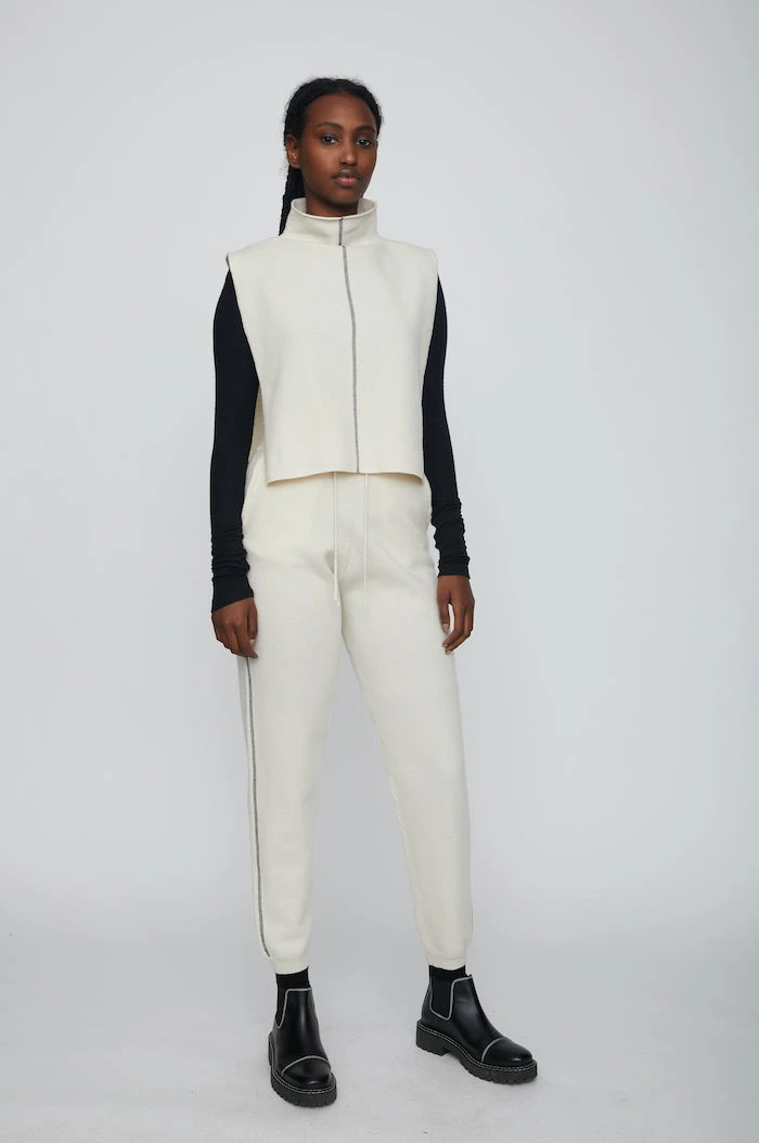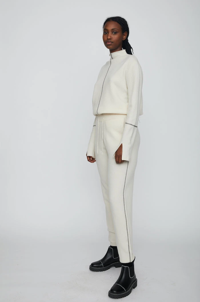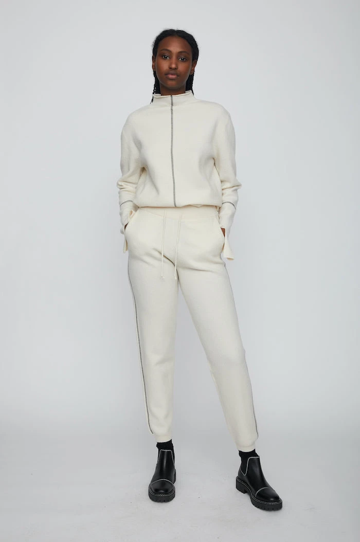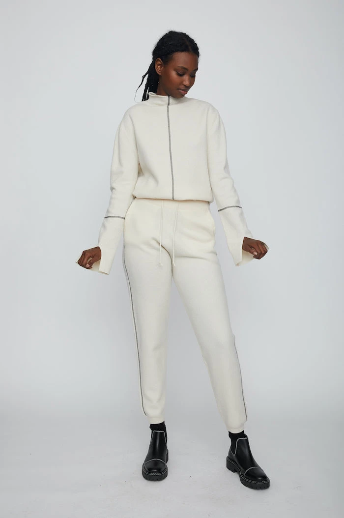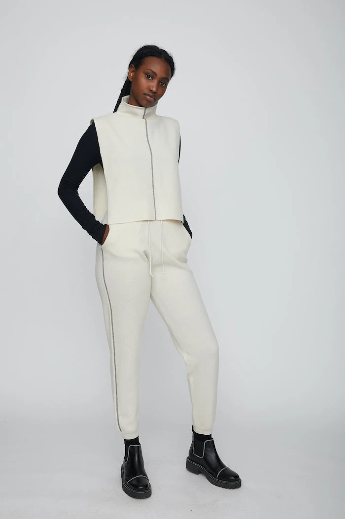 Just Fair knit jogger wool pants. They have a ribbed elastic waist with tie strings, side pockets, contrasting stitching along each side and ribbed trim at the bottom. Pair with matching Fair Knit Blouse.