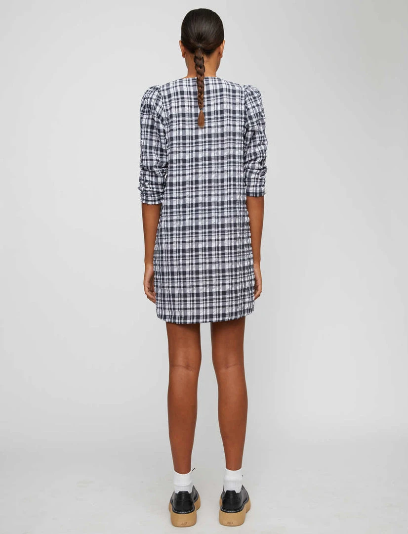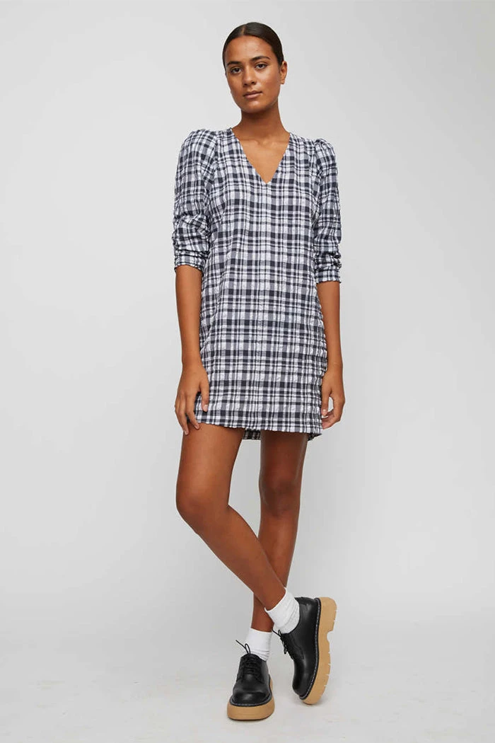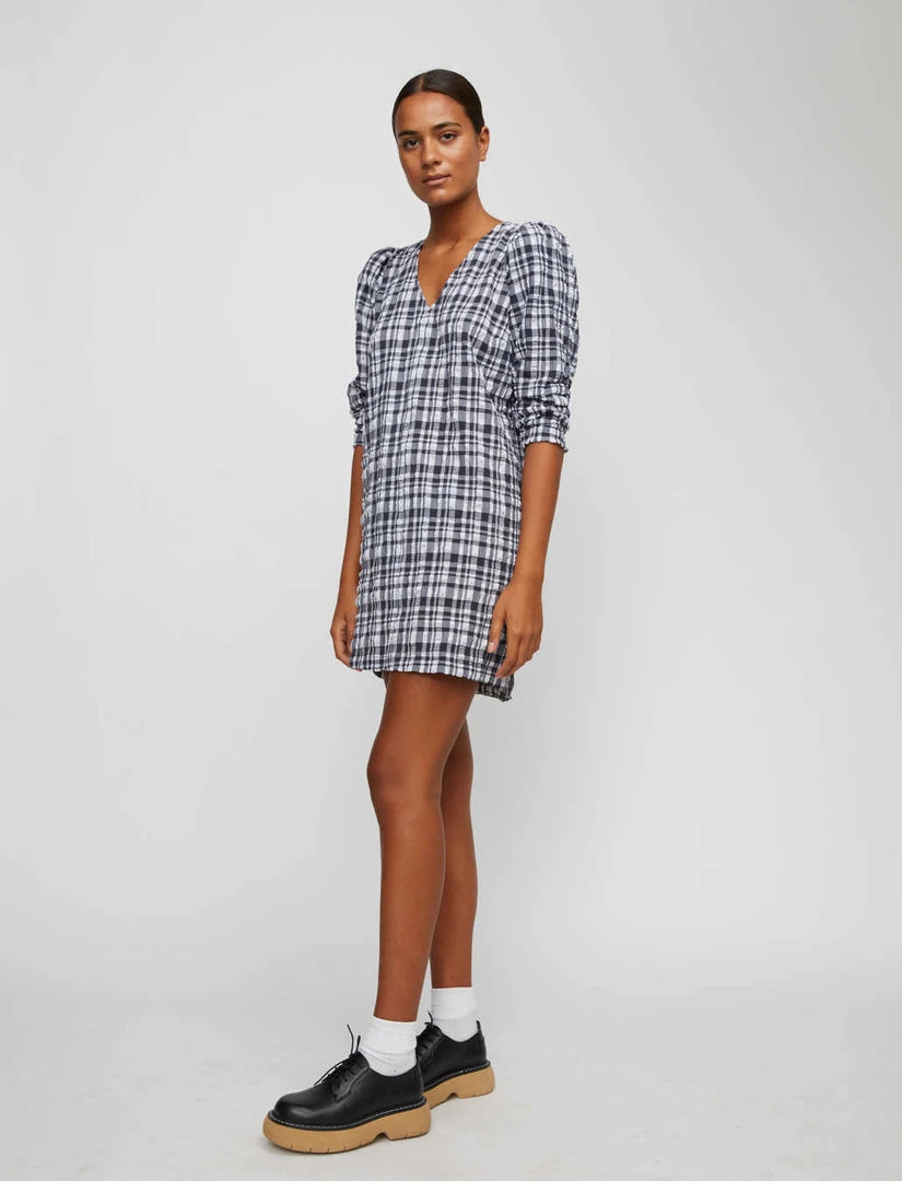 Just Female plaid gingham Hamilton V neck mini dress in lightweight, textured, crinkle fabric.