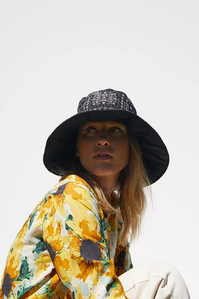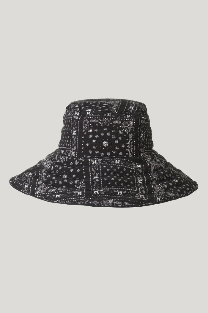 Just Female large Miracle hat in black paisley. Quilted sunhat with an all-over paisley print. The has a large brim that can easily be styled due to the quilted quality.