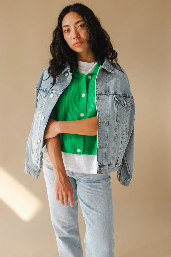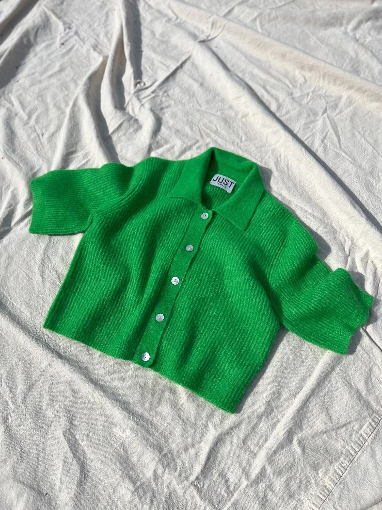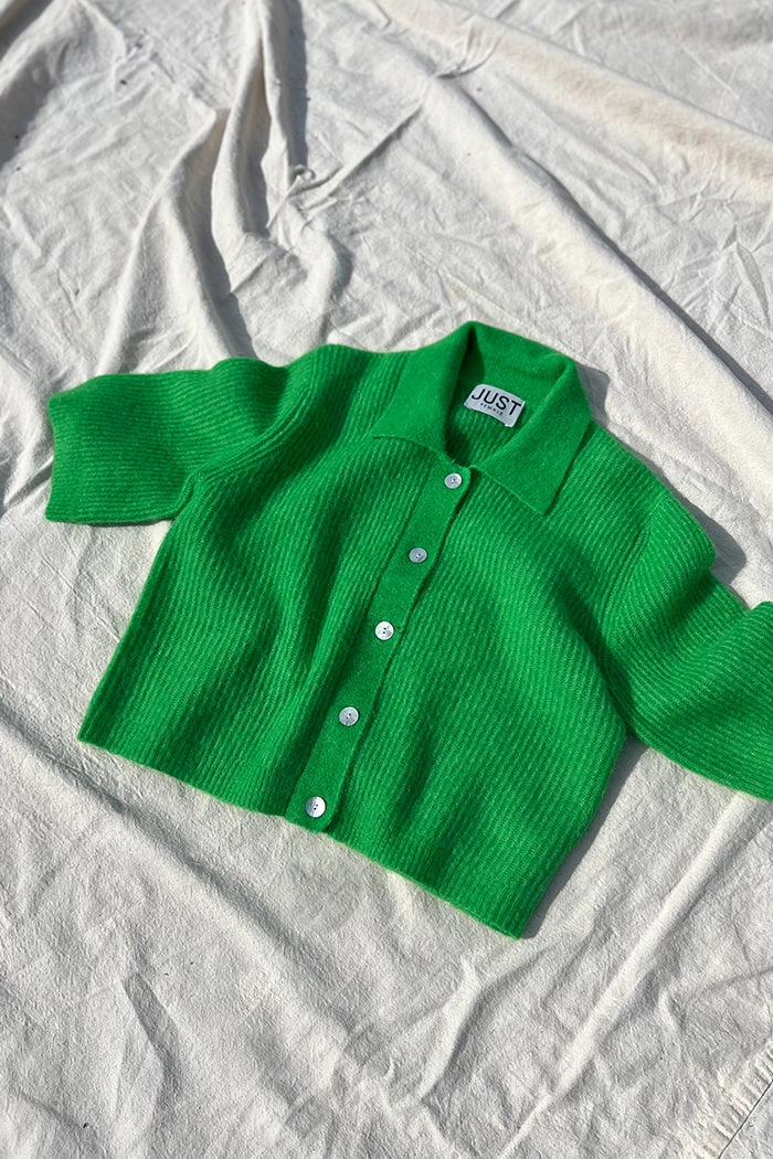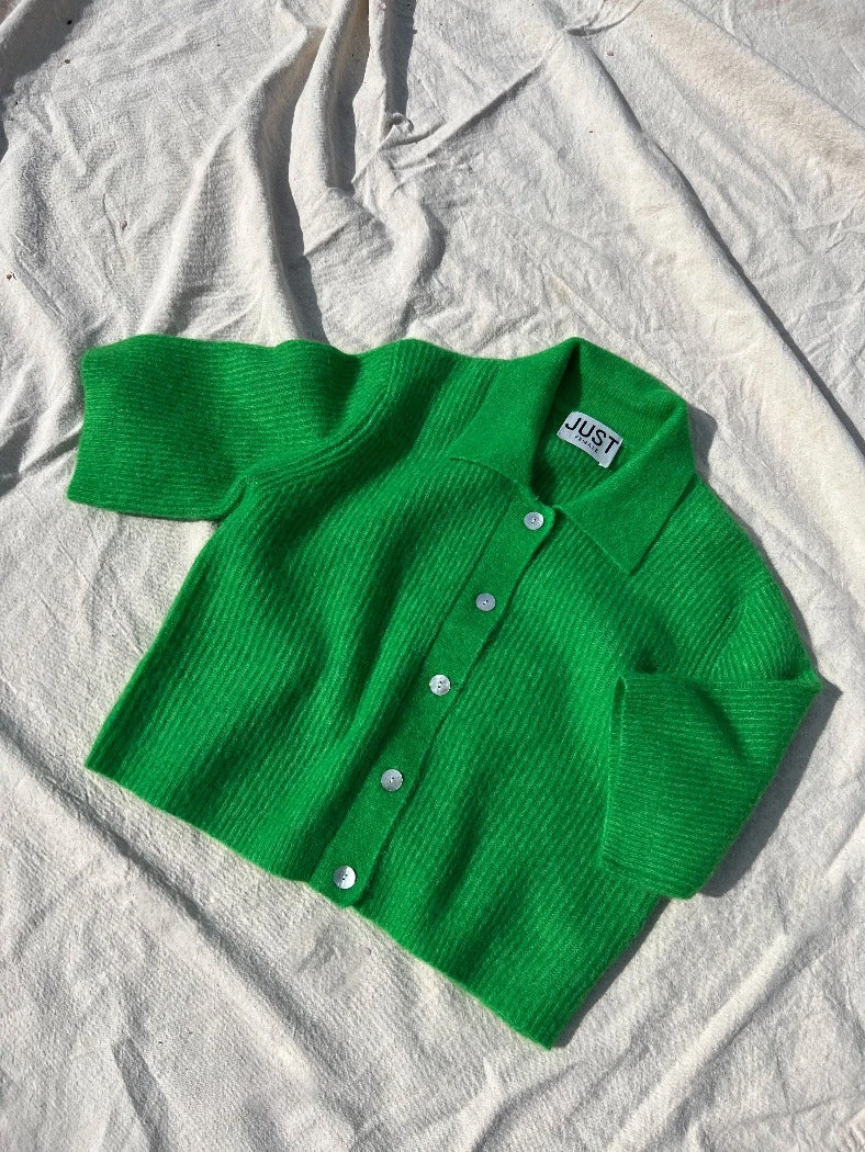 Just Female Rebelo short sleeve cardigan sweater in vibrant fern green.