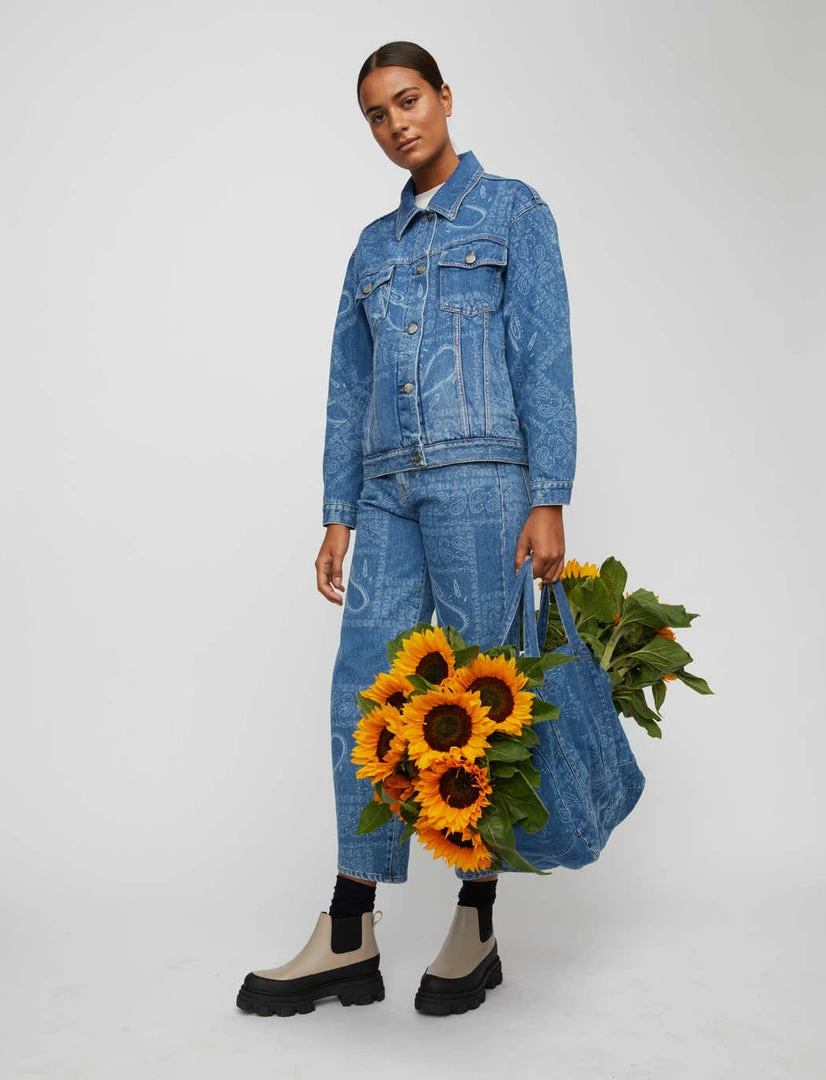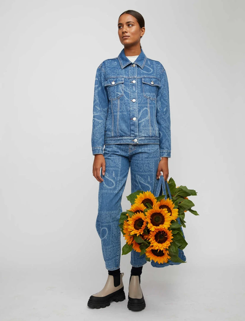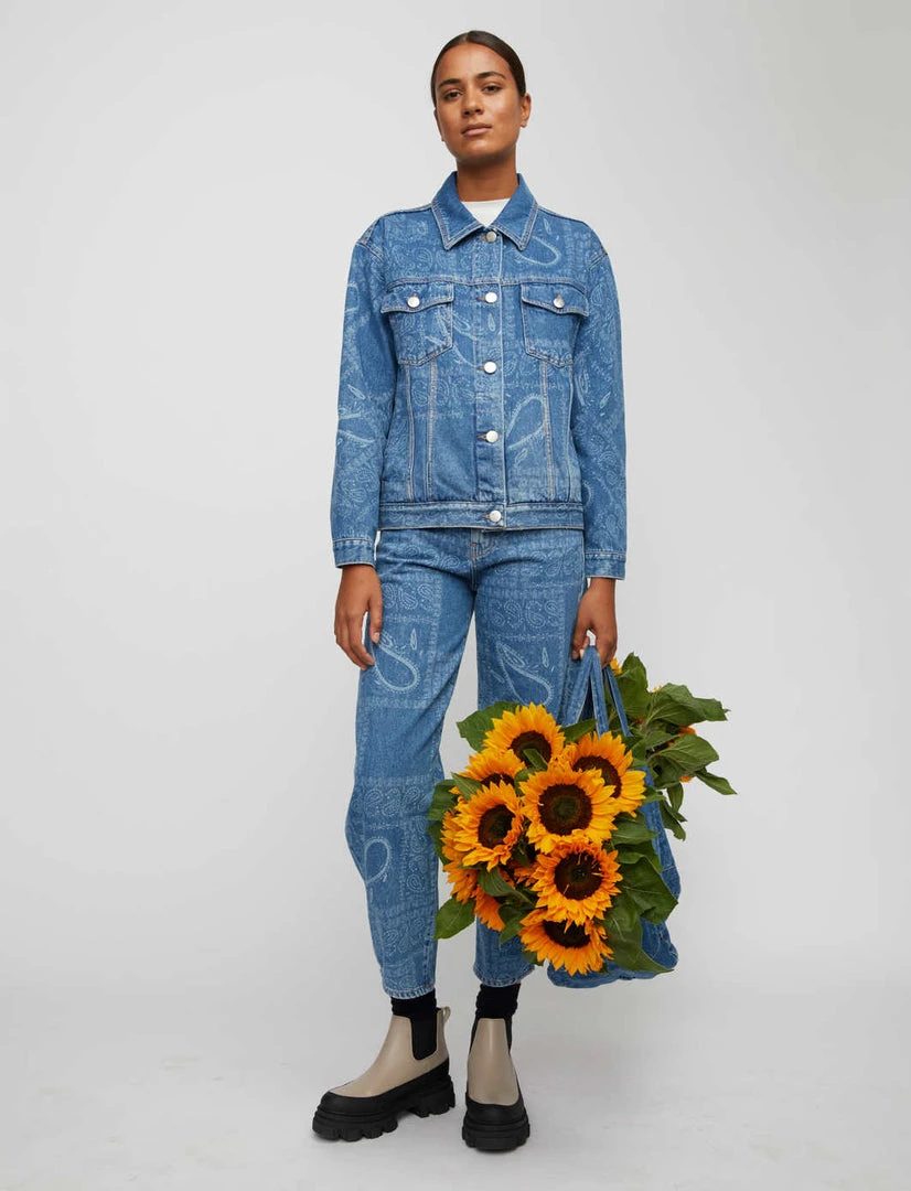 Just Female blue denim Swift jacket with an all over paisley print. This jean jacket has a classic collar, silver button closing, side and breast pockets. The fit is boxy and casual. Style it boldly with the Bold Jeans in the same material and wash for the full look.