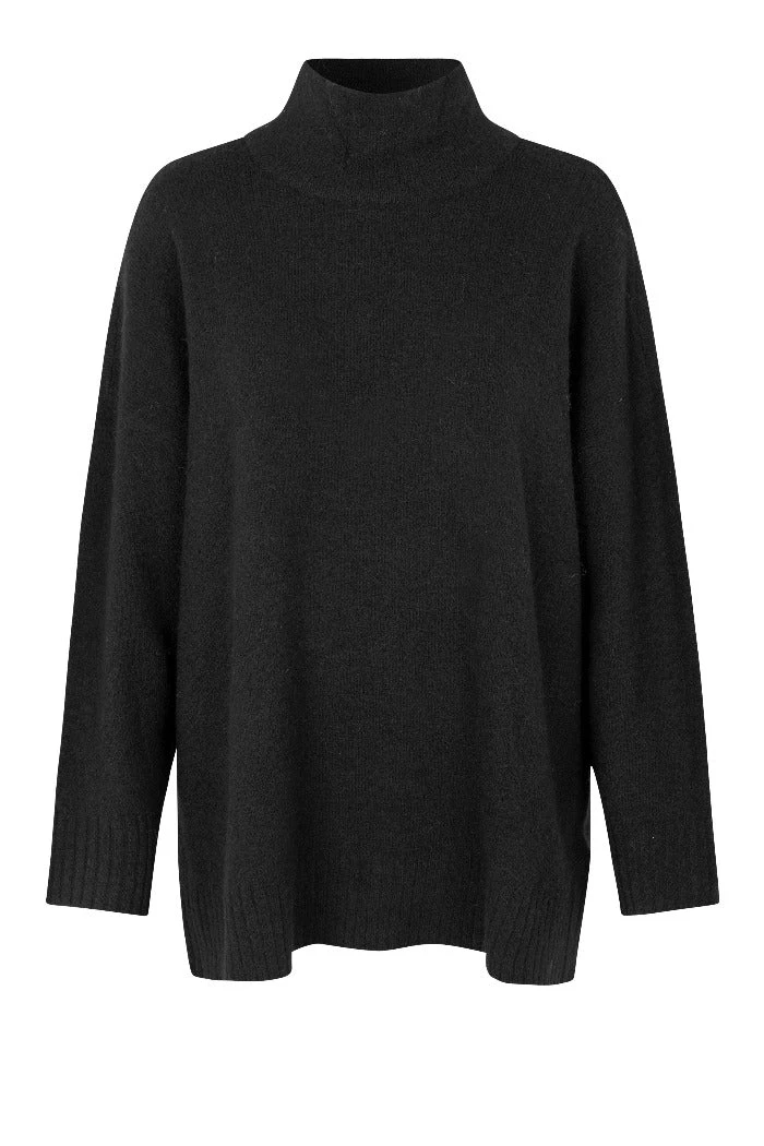 Just Unite knit turtleneck sweater in soft wool black. Casual knit has a high neck with an oversize fit and dropped shoulders. The neck, the edges of sleeves and the bottom are rib. Style it with the Unite Knit Trousers for a complete lounge set.