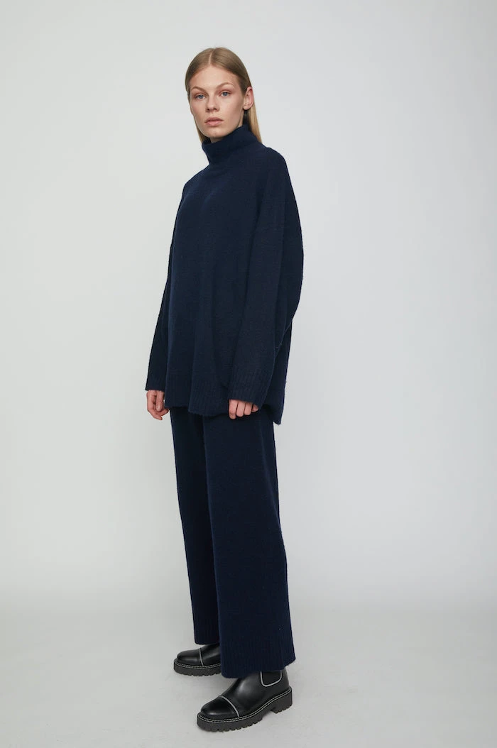 Just Unite soft wool knit trousers in evening navy blue. Pair with the unite blouse or dress for a matching set.
