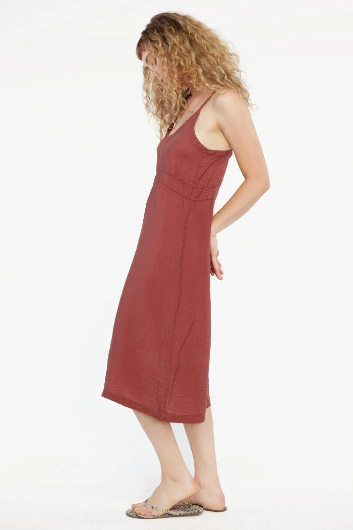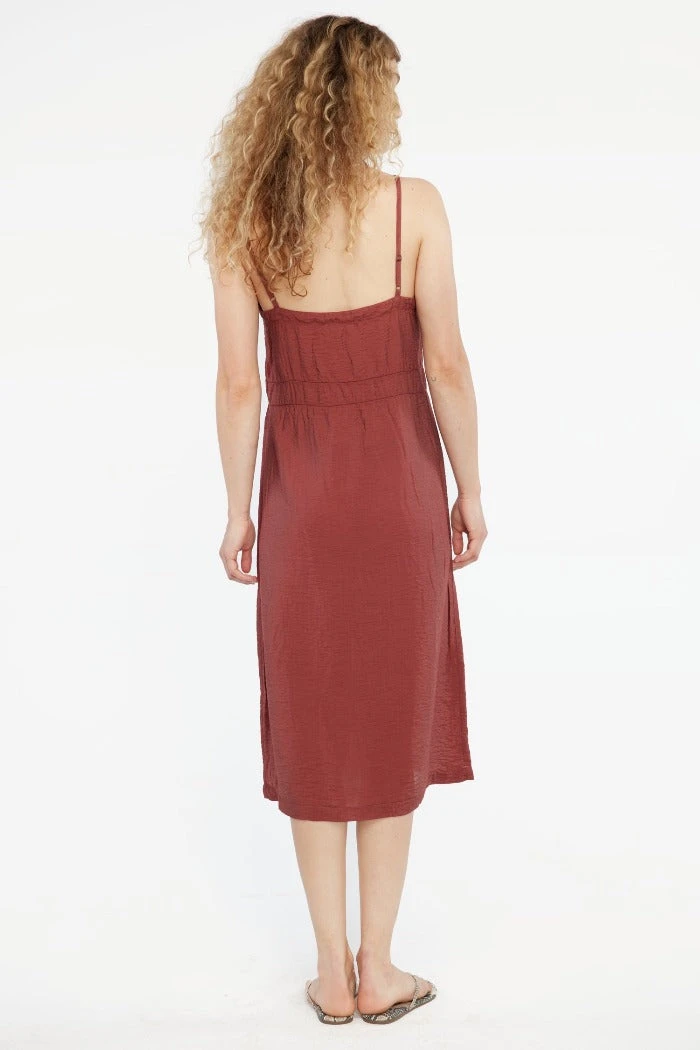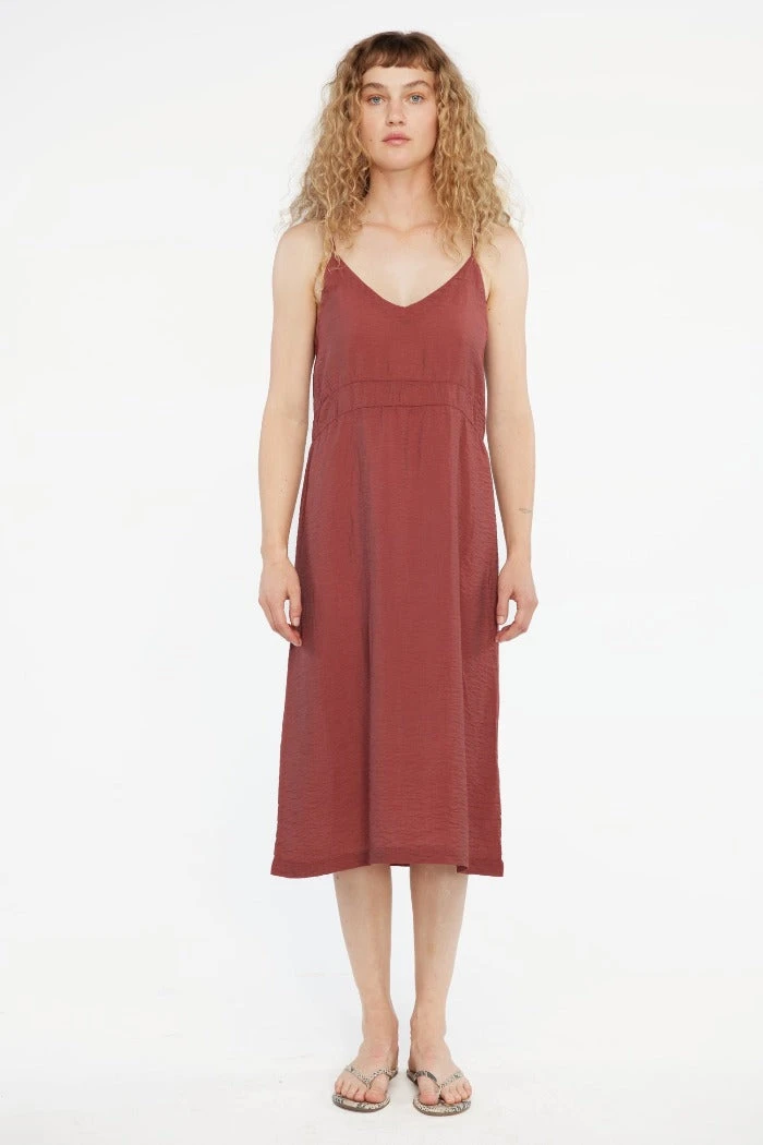 Lacausa Alma Slip Dress is a lightweight spaghetti strap slip dress in cocoa. Loose fit with v neckline. Crafted with crinkled fabric that makes the Alma great for layering or worn on its own. Complete the look with mules and oversized handbag.