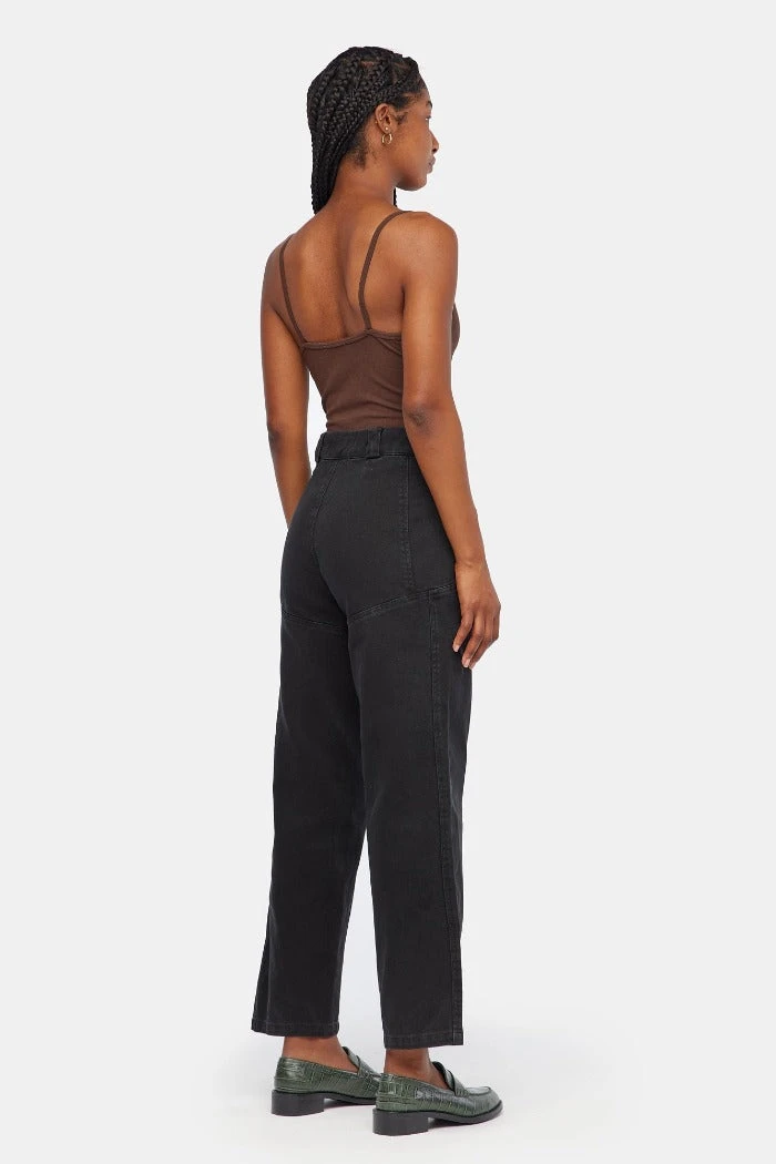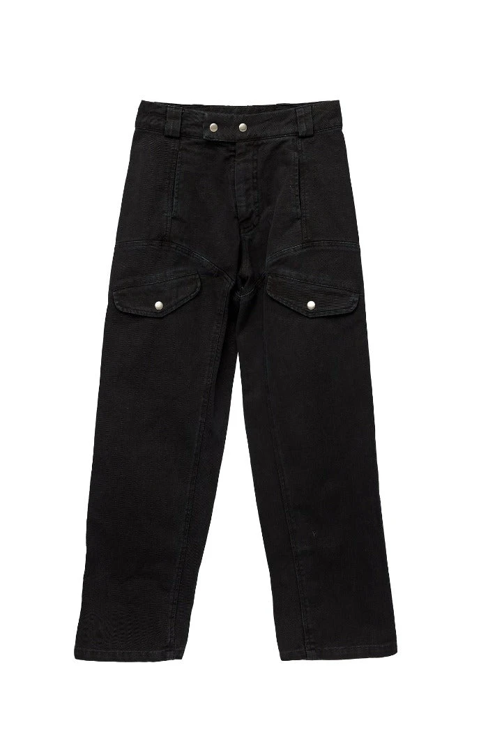 Lacausa Diego cargo trousers in washed black. Vintage menswear inspired four pocket work pants with seam details on front and back, zipper fly with snap closure. High rise with a straight, slightly tapered leg for a flattering, feminine fit. Made from garment dyed bull denim.