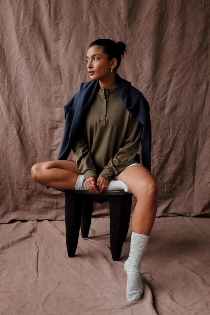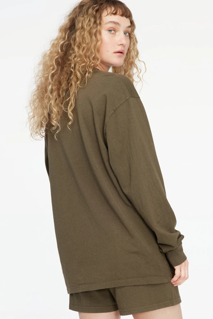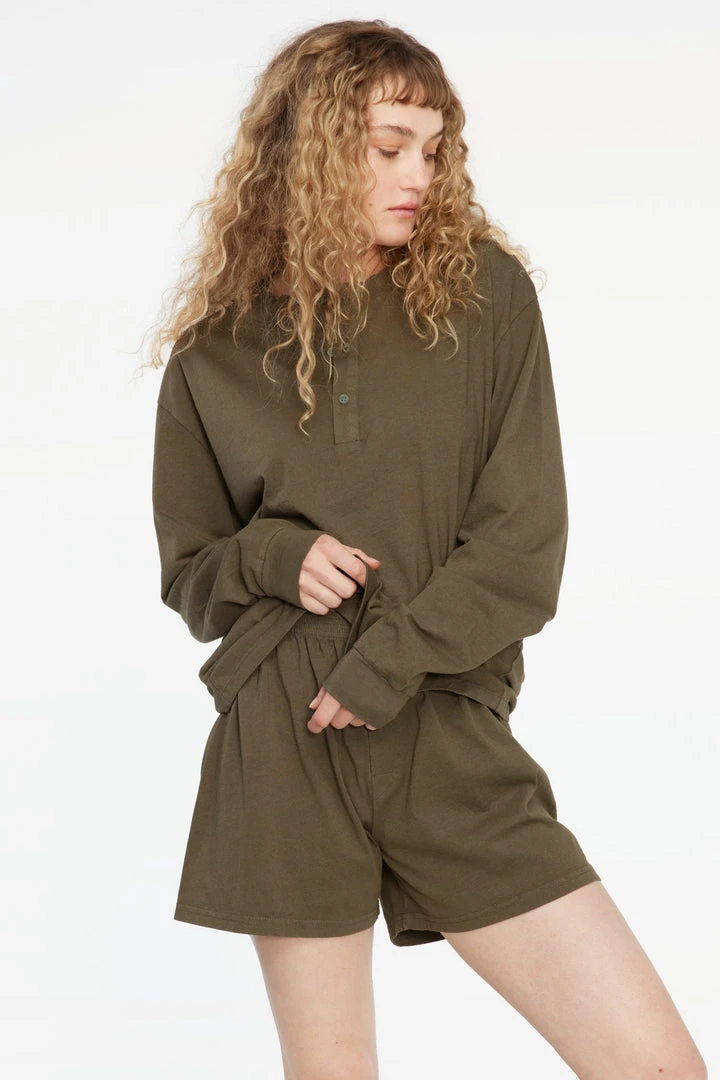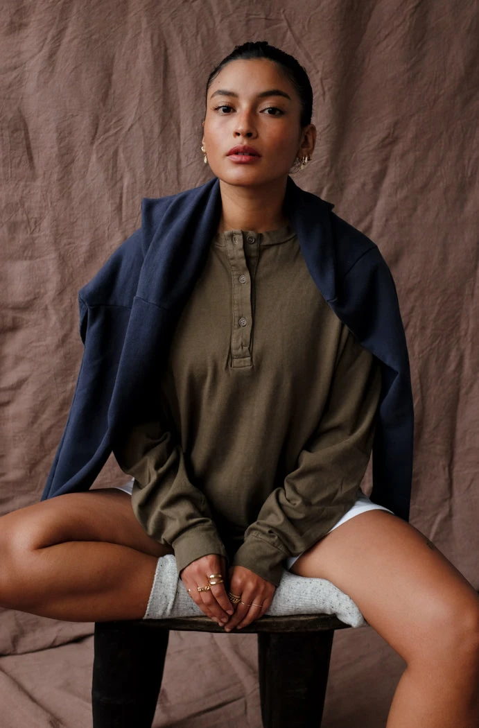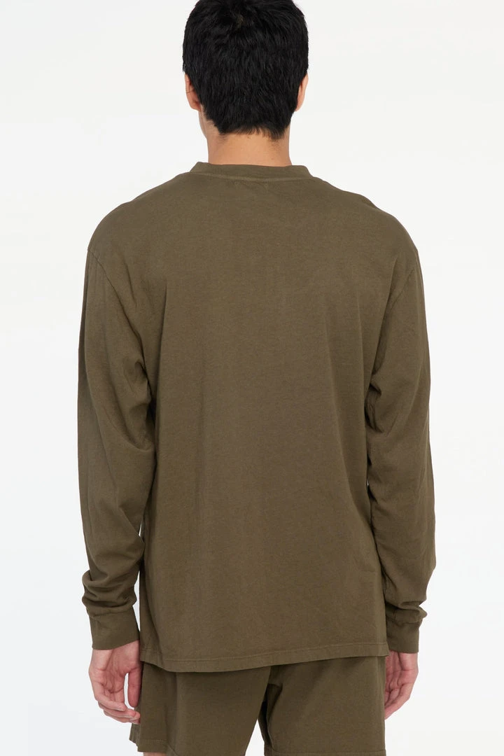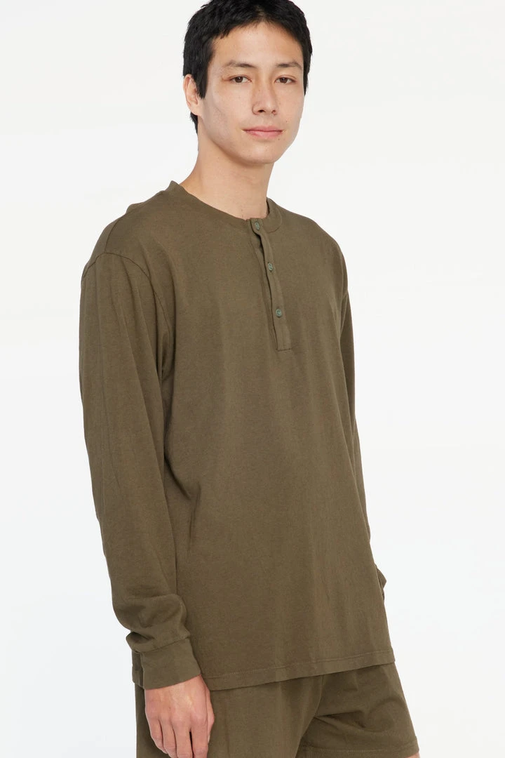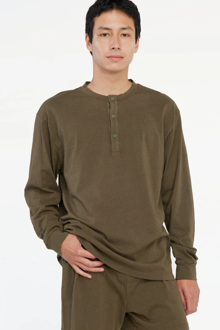 Lacausa Lolo henley in basil rich dark green. A classic, vintage inspired henley tee in medium weight organic cotton jersey. Garment dyed for added softness. Universal unisex fit for everybody.