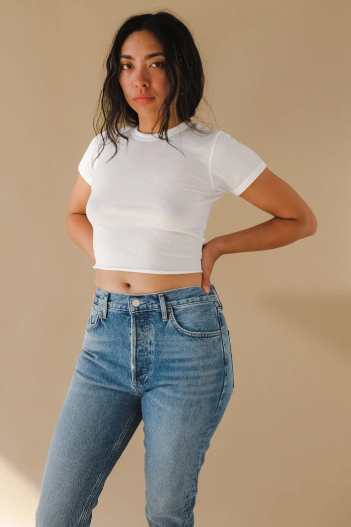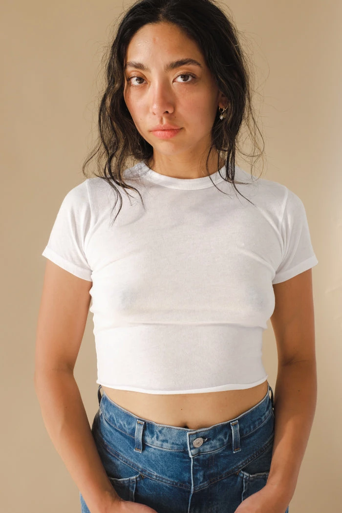 Lacausa baby Smith tee in white. This super soft shrunken tee is made of an organic cotton, recycled poly blend that gives it a slightly heathered look and the softest handfeel.