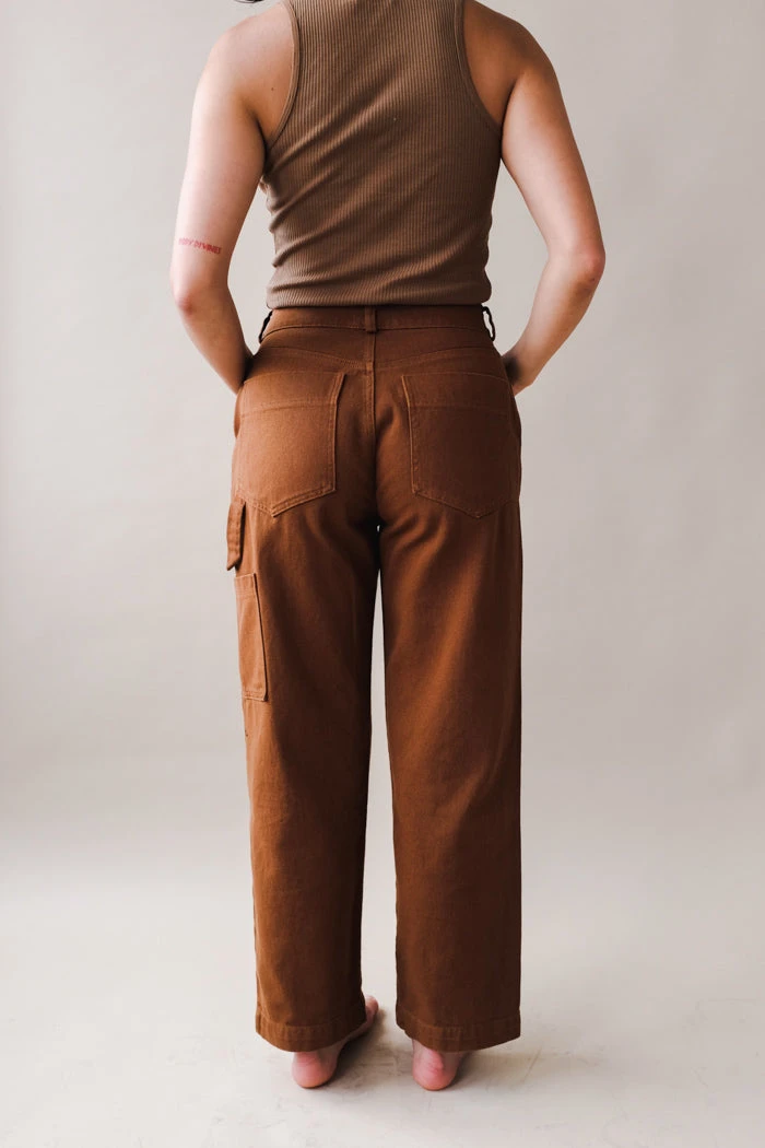 Lacausa Aiden cargo style trousers are a classic mid-rise workwear pant in a soft cotton bull denim with a straight leg in toffee.
