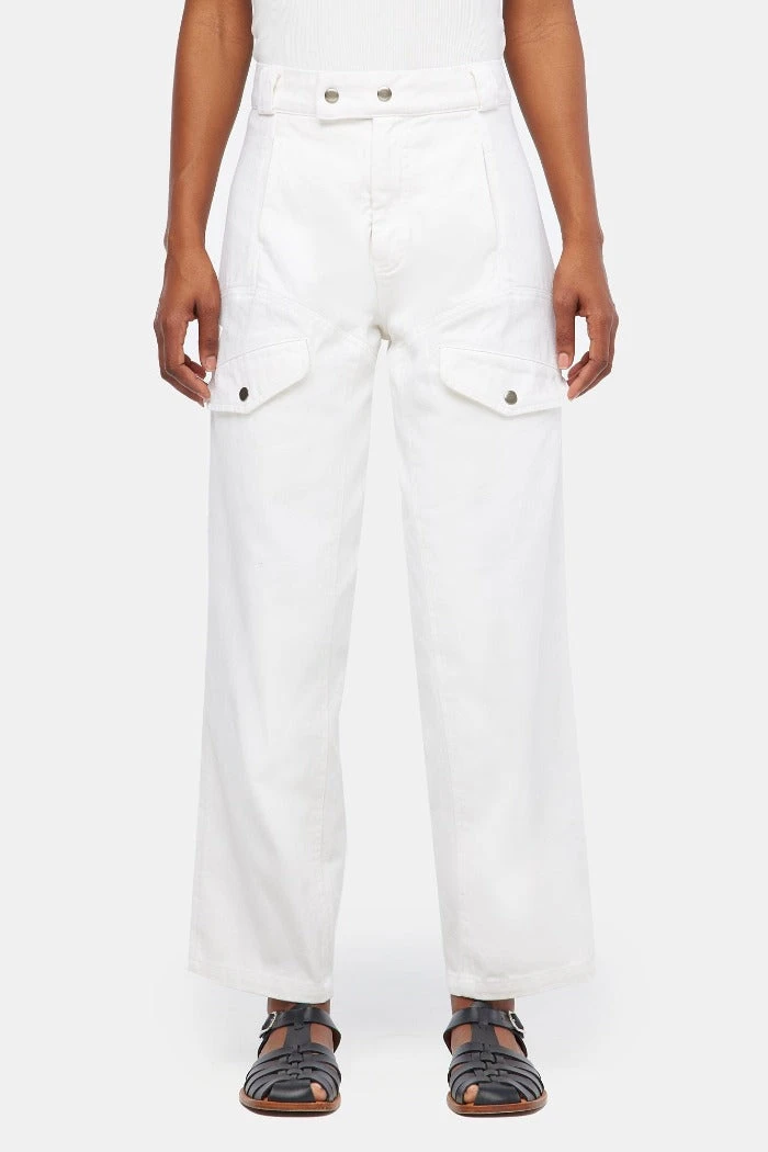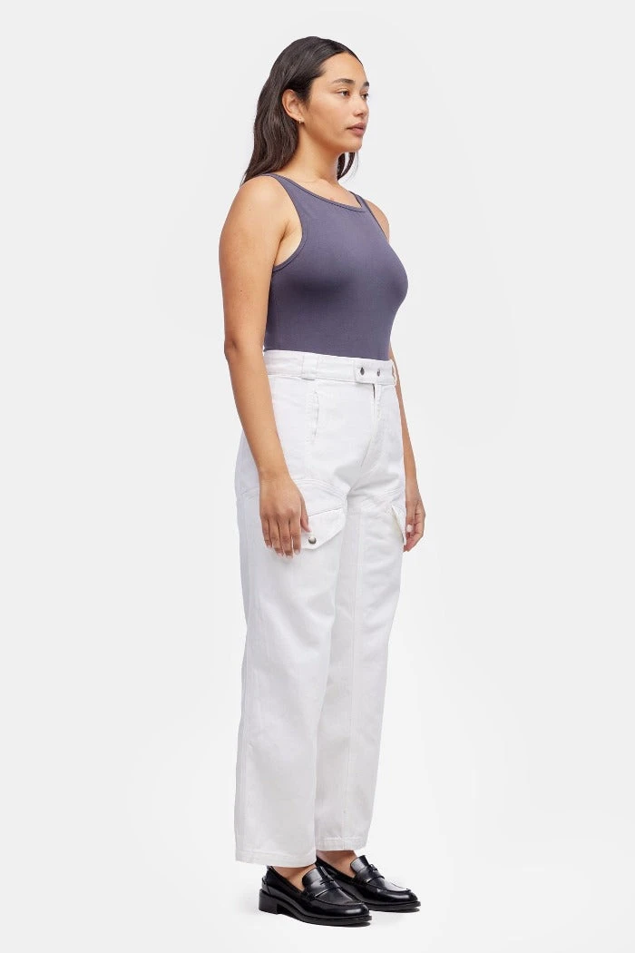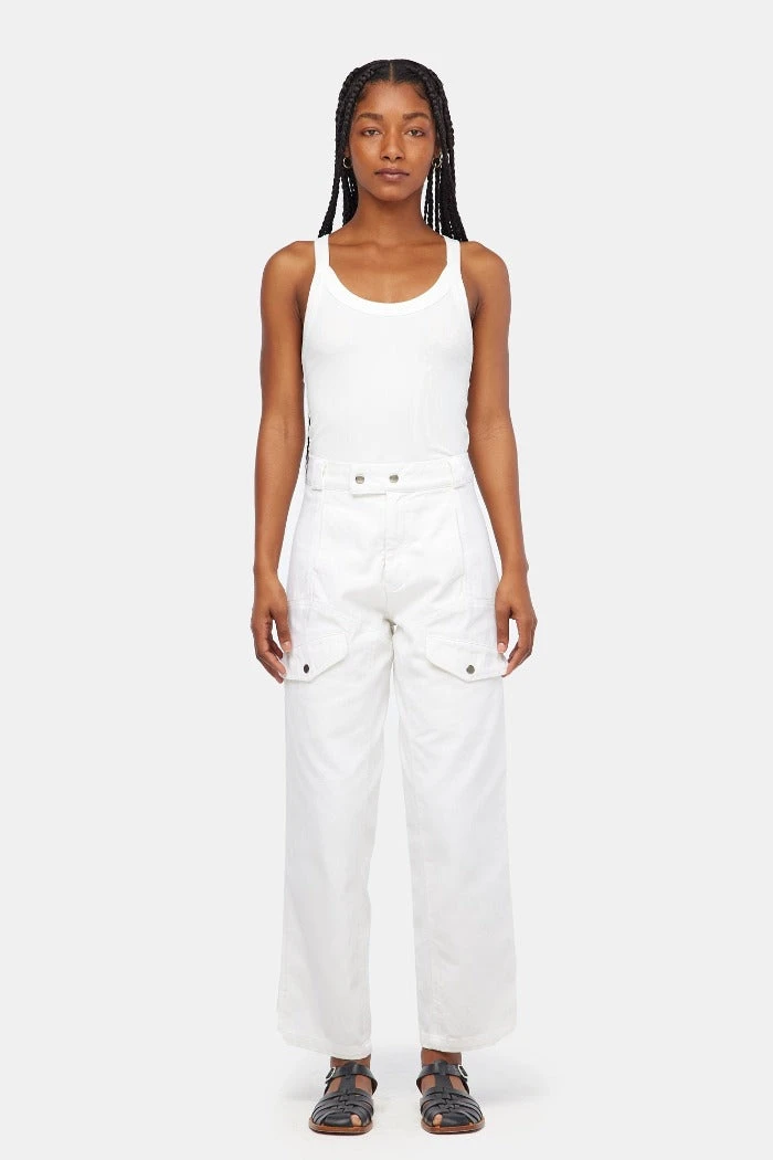 Lacausa Diego cargo trousers in parchment white. Vintage menswear inspired four pocket work pants with seam details on front and back, zipper fly with snap closure. High rise with a straight, slightly tapered leg for a flattering, feminine fit. Made from garment dyed bull denim.