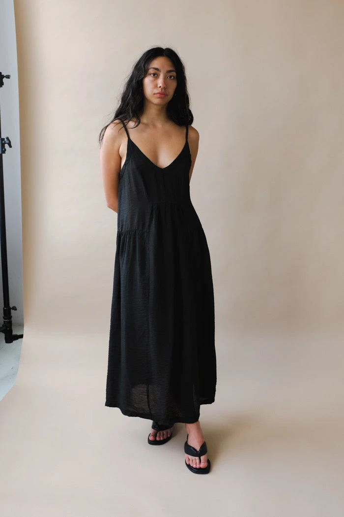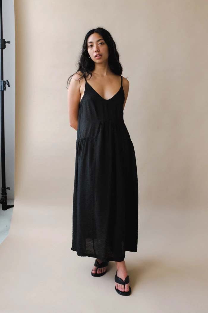 Lacausa Thea slip dress in black. A timeless slip dress with v neckline, adjustable straps, paneled details and feminine shirring for a bit of subtle volume. Made from lightweight, textured parachute fabric.