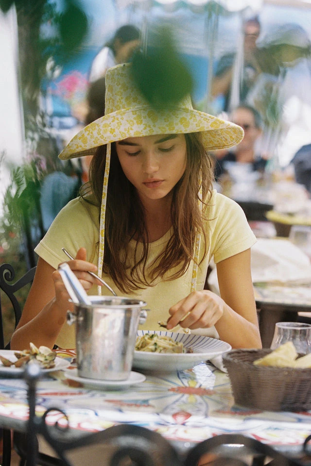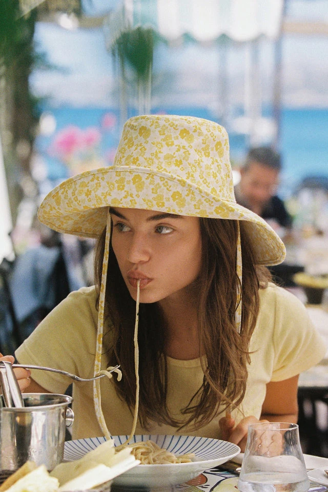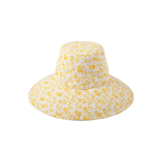 Lack of Color Holiday wide brimmed canvas bucket hat in sunshine bloom yellow floral print. Finished with a neck tie to secure the hat to your head on all the adventures your day may bring you.