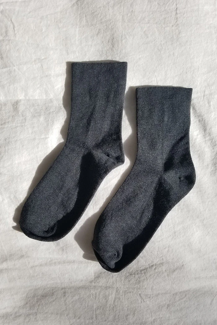 Le Bon Shoppe thin sneaker socks in heather black. A wider band with a simple and clean finish. Designed not to leave marks on your skin, like a rubber band. The perfect height made with a cotton blend, this breathable sock is perfectly suited for your favorite sneakers.