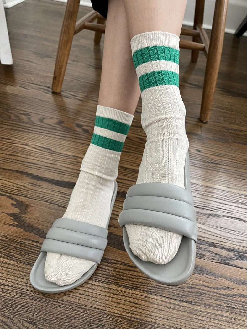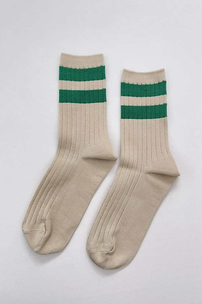 Le Bon Shoppe her varsity socks in cream with green stripes. Bold stripe edition of her socks in mercerized combed cotton. The perfect height, knit rib socks.