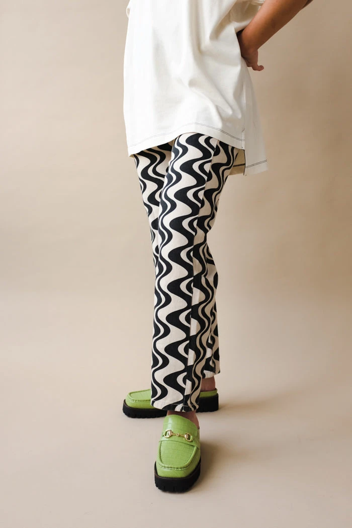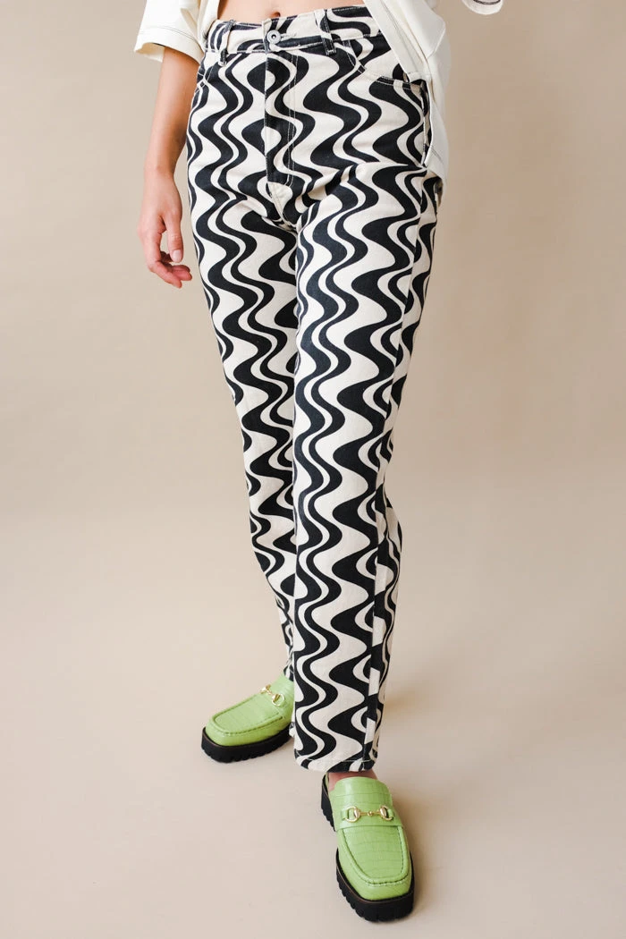 Mandinga Wave black and white printed denim jeans. Mid rise, zip fly, and straight leg.