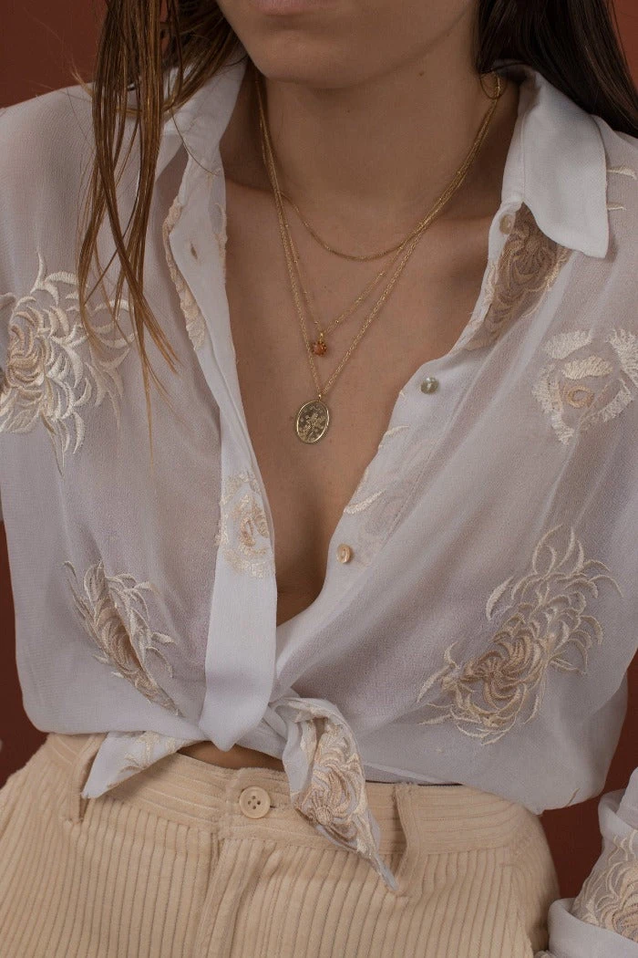 Merewif Diana gold engraved necklace. The artwork is based on roman goddess Diana, who was a roman goddess of the hunt & the moon, and had the power to talk to animals.