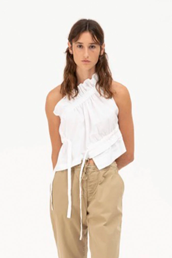 Mundaka Ruffle one shoulder top in white. Adjustable ties, to sinch the top in or make it more flowy.