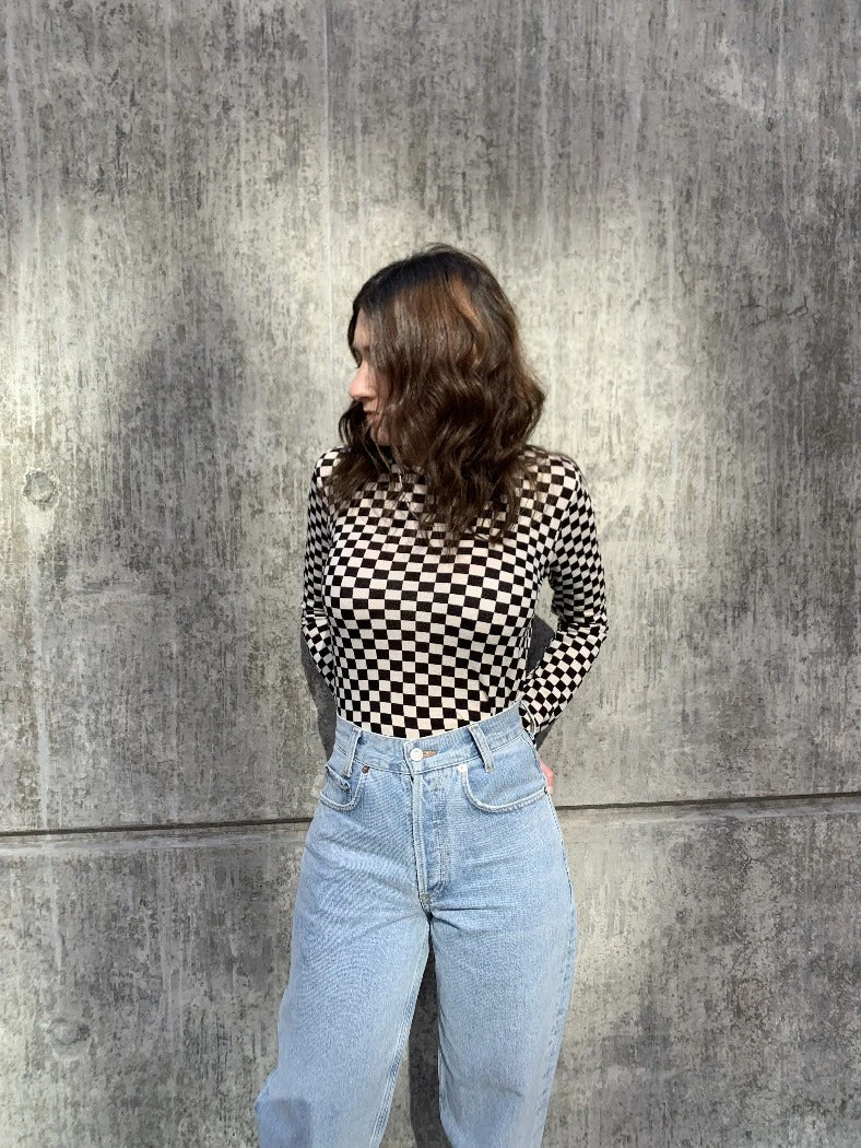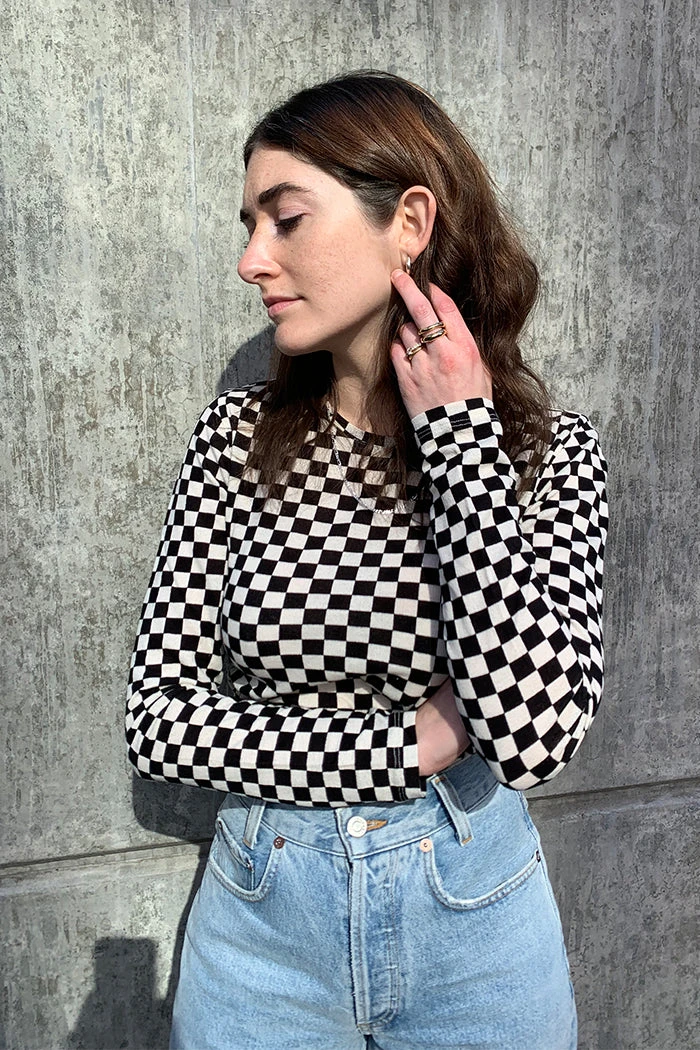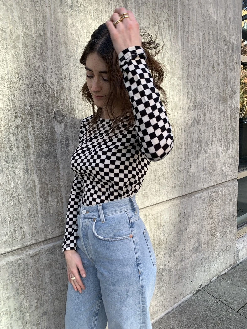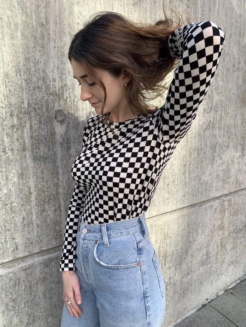 Round neck, thin black and white checkered long sleeve tee shirt.