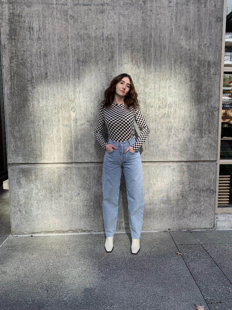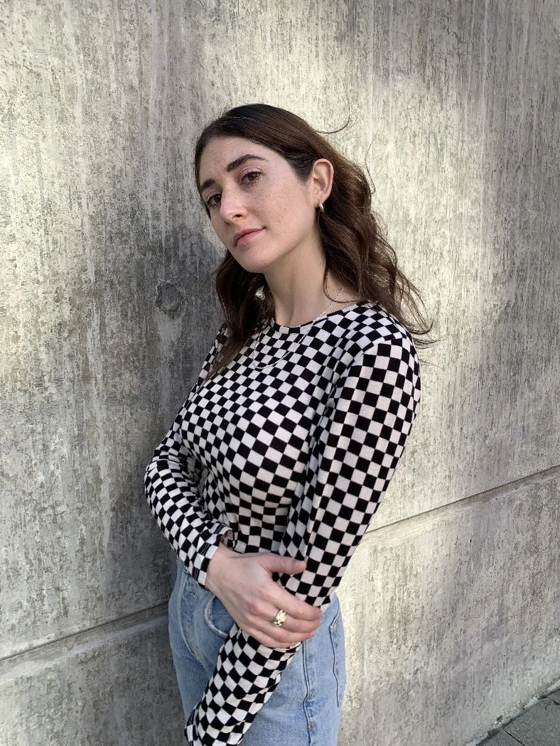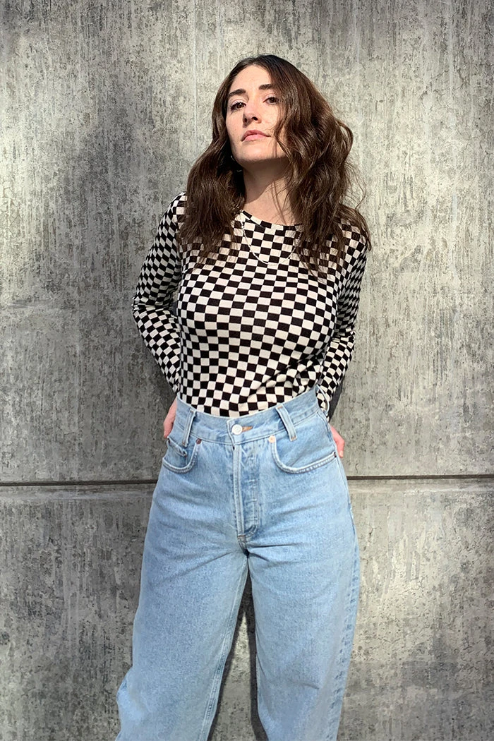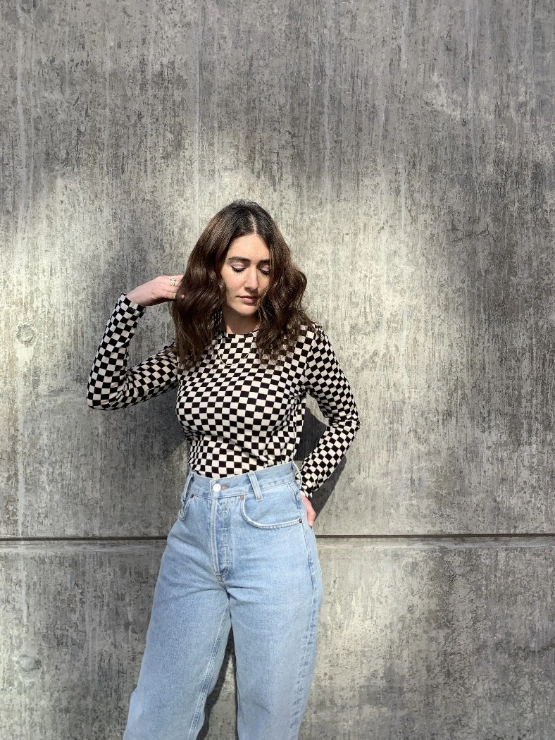 Round neck, thin black and white checkered long sleeve tee shirt.