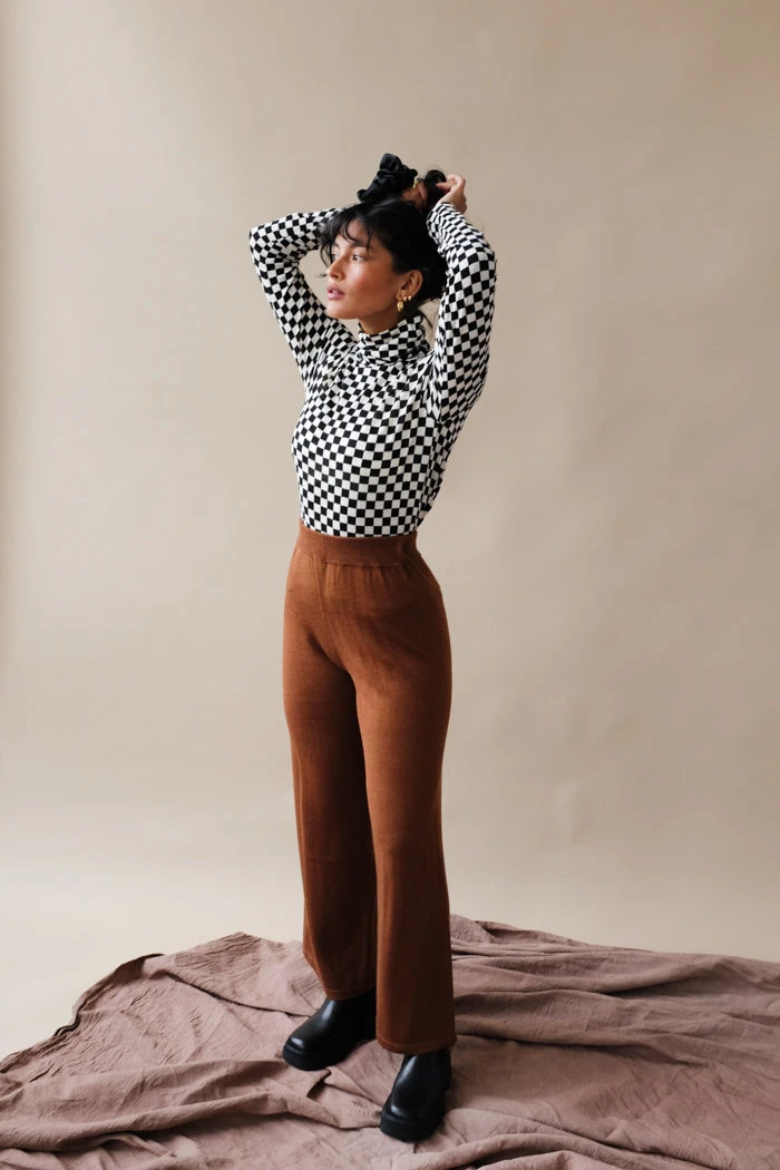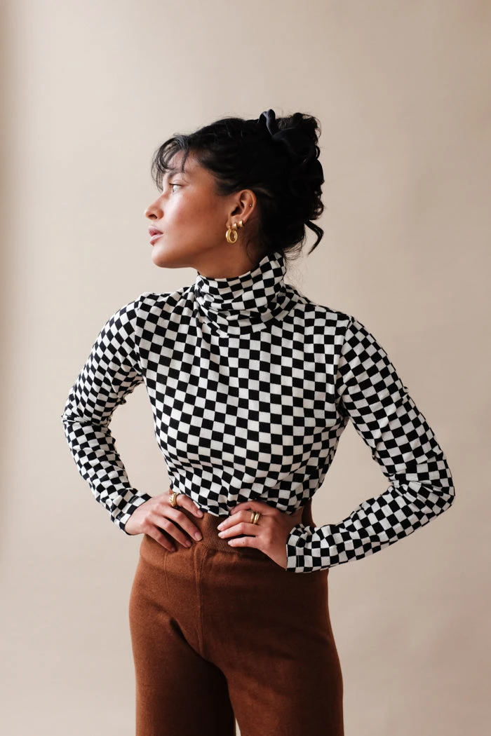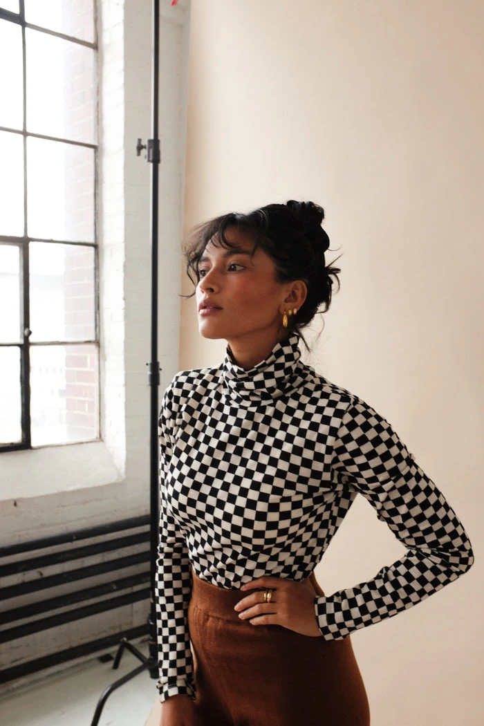 Thin, form fitting, black and white checkered long sleeve turtleneck tee shirt.