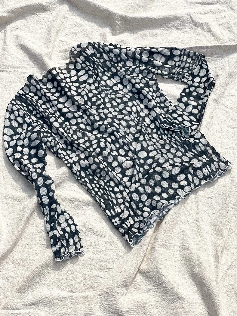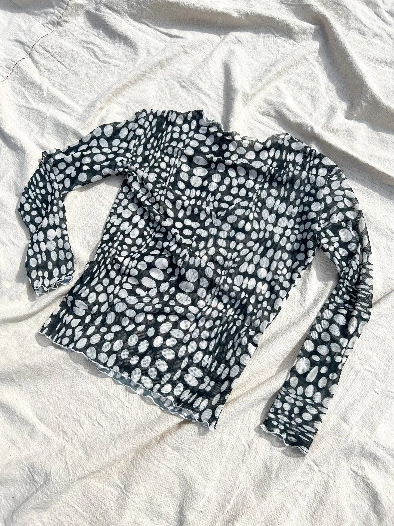 Nin Studio black cosmos Swirl mesh long sleeve top. Lettuce hem.Â