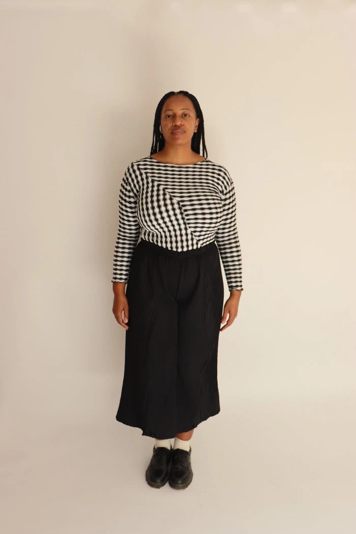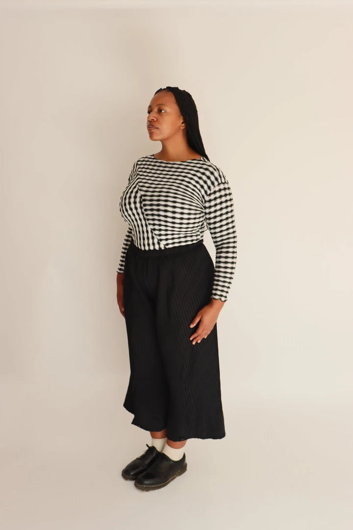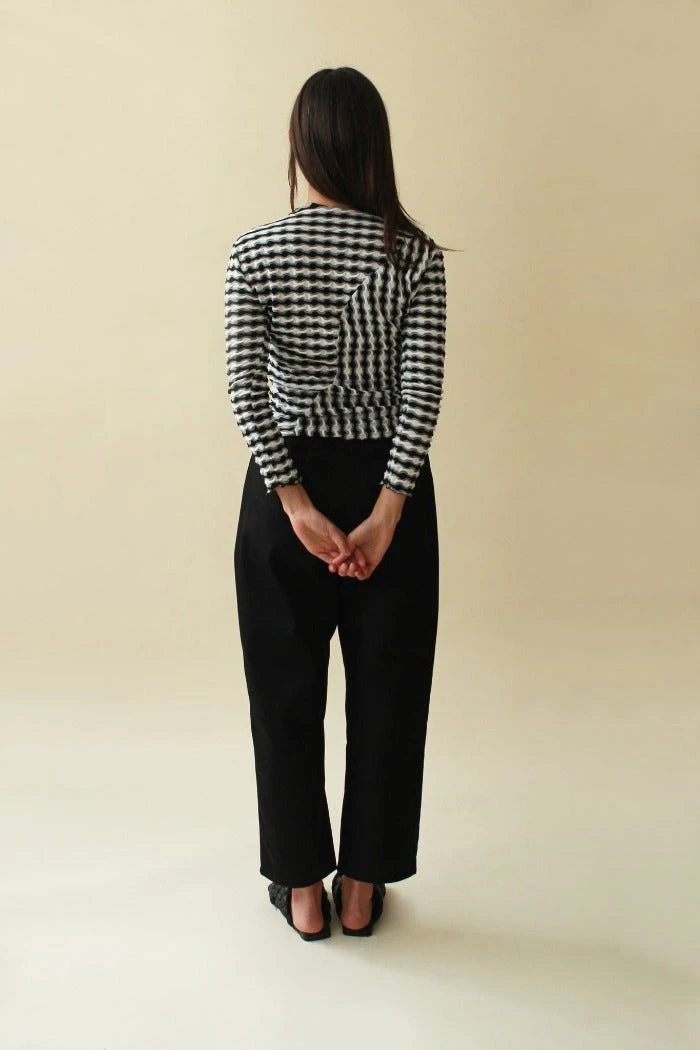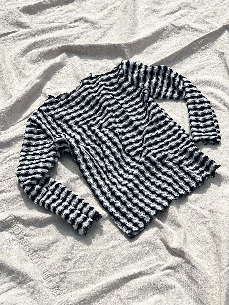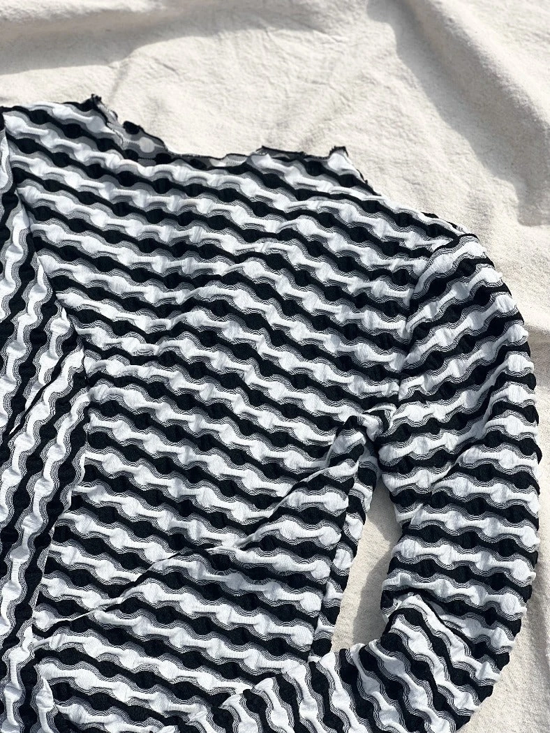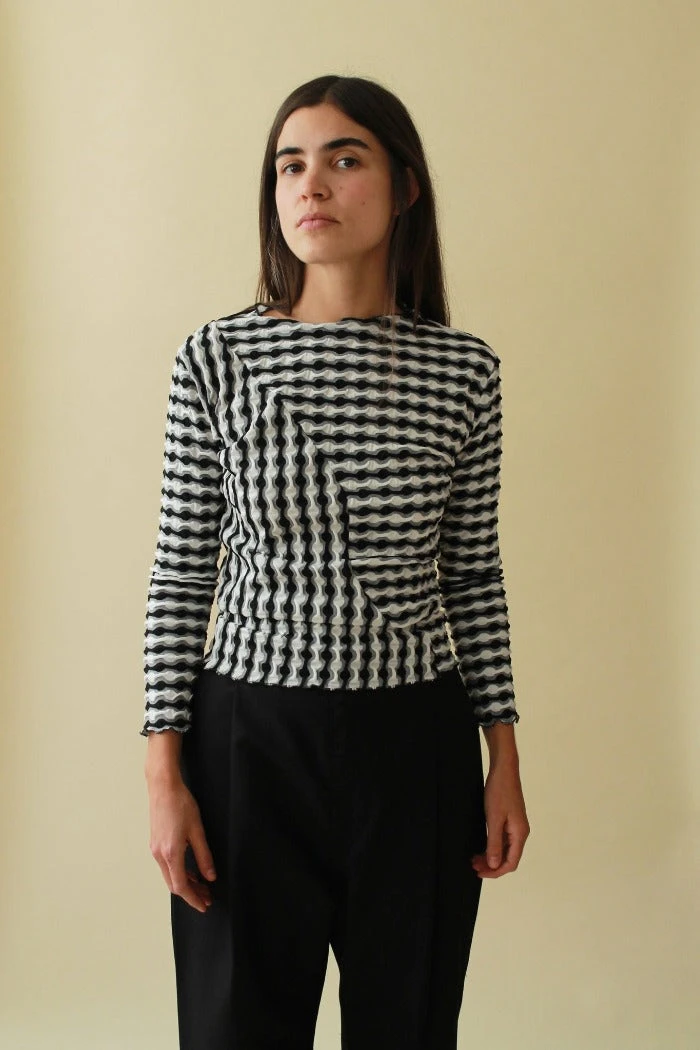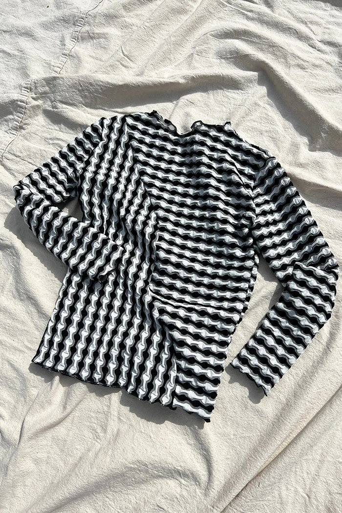 Nin Studio flattering Infinite Circle Swirl, black and white, long sleeve top. Inspired by the unconscious and conscious in constant communication, The Swirl Top is a hypnotic mix between fabrics. Lettuce hem.