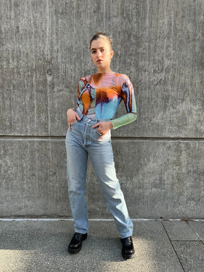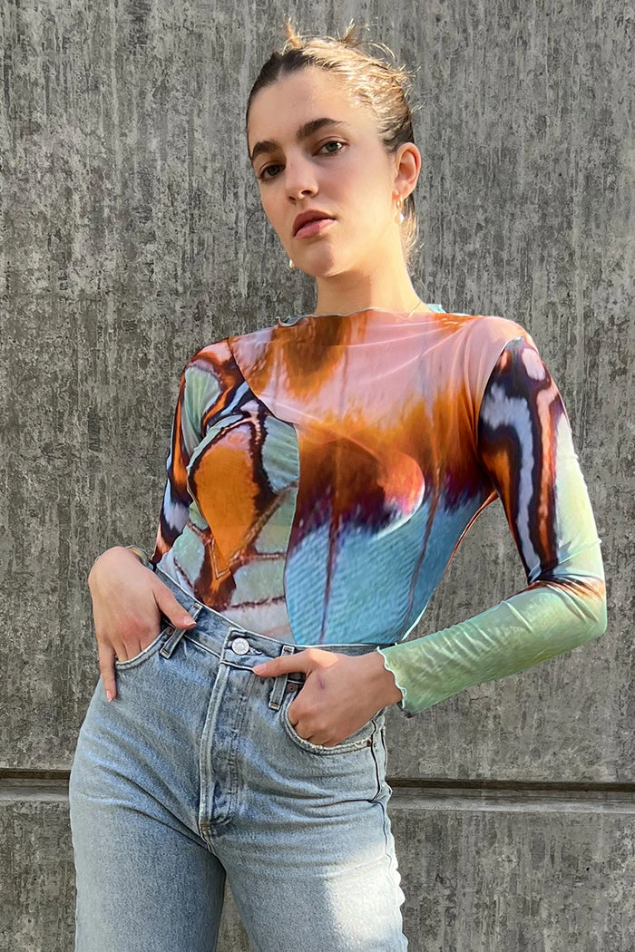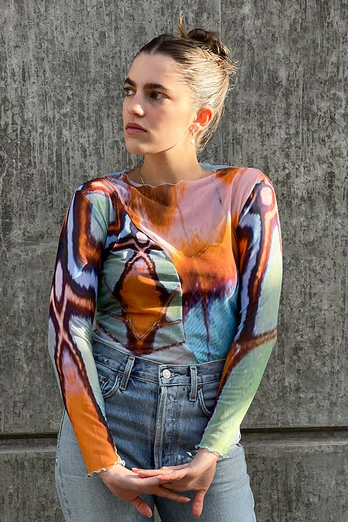 Nin Studio colorful Mariposa Swirl mesh long sleeve top. Inspired by the unconscious and conscious in constant communication, The Swirl Top is a hypnotic mix between mesh fabrics. This shirt is long sleeve and can be layered or worn on its own. Lettuce hem.