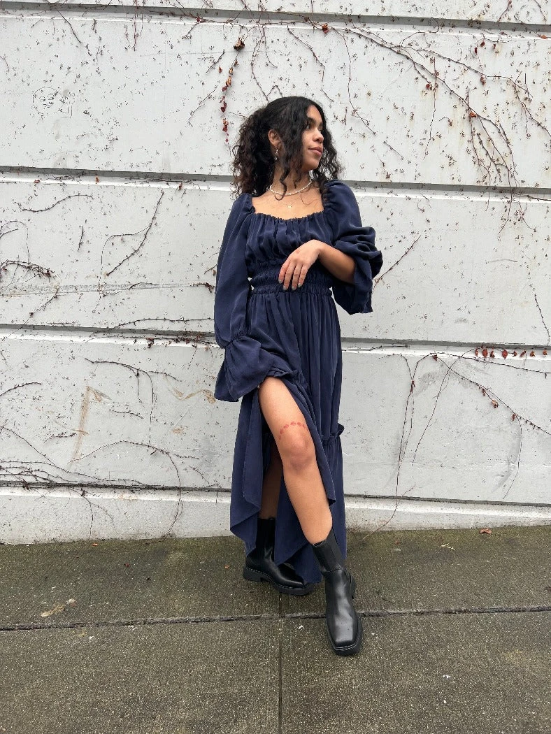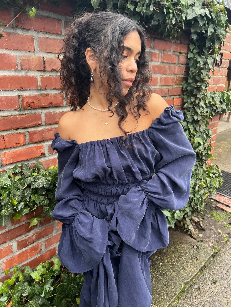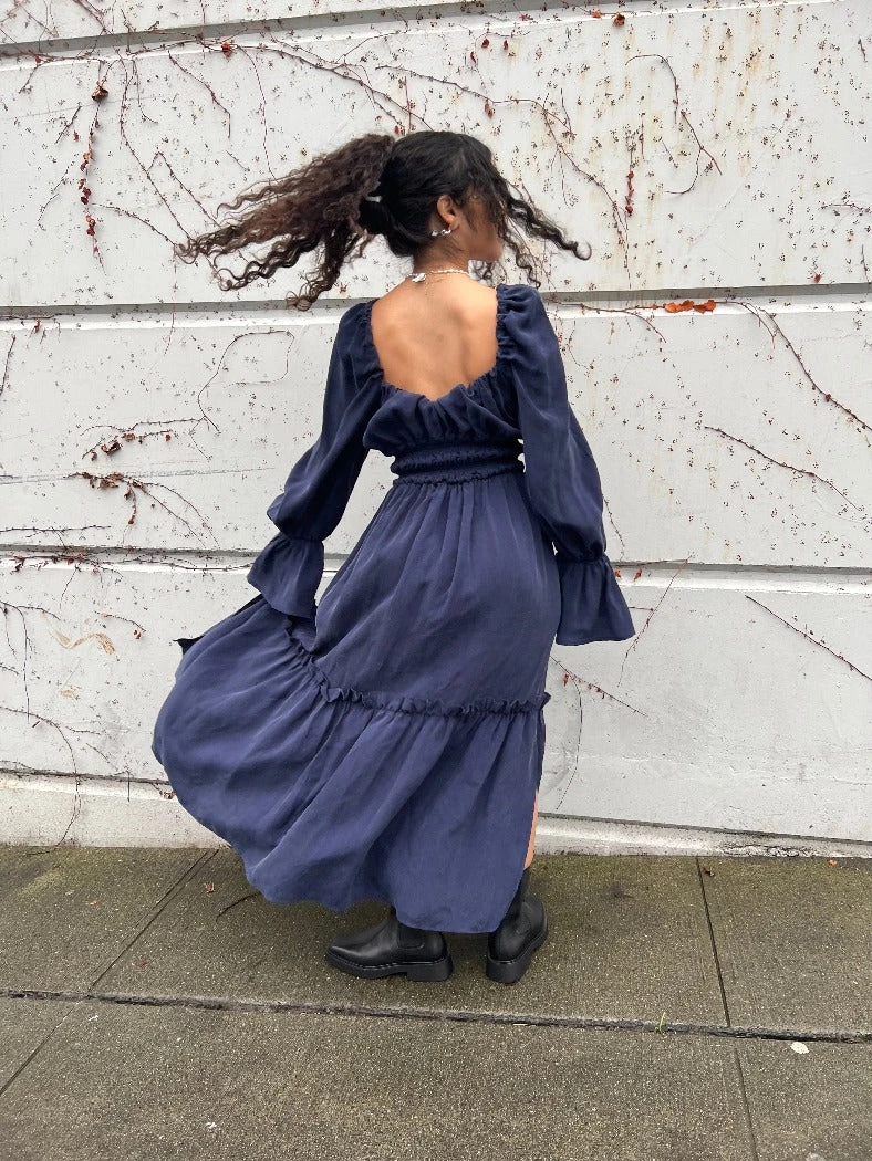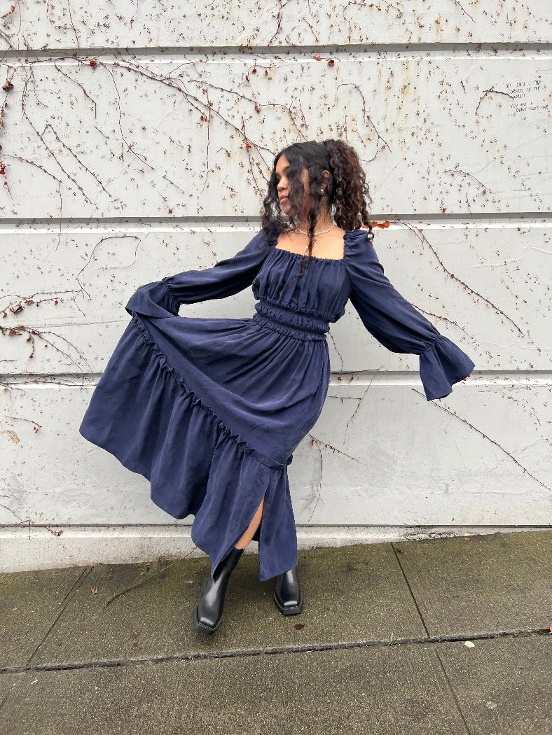 Ohsevendays Willa vegan silk midi peasant dress with elasticated waist, square neckline and peasant sleeve. Features side pockets and flowy ruffle cuff.