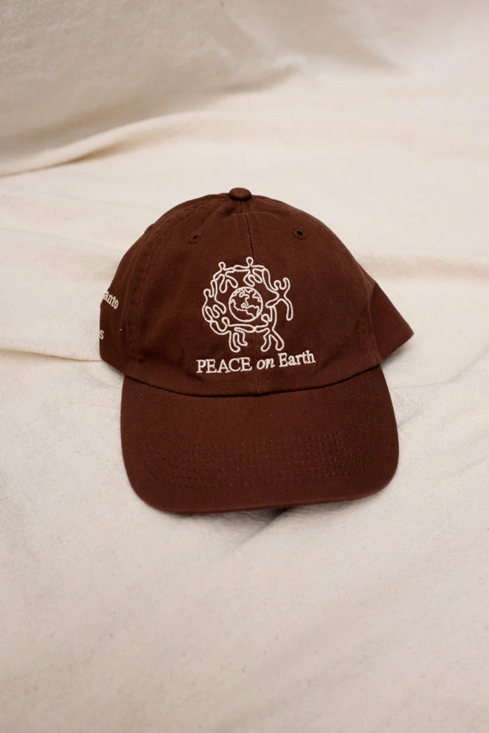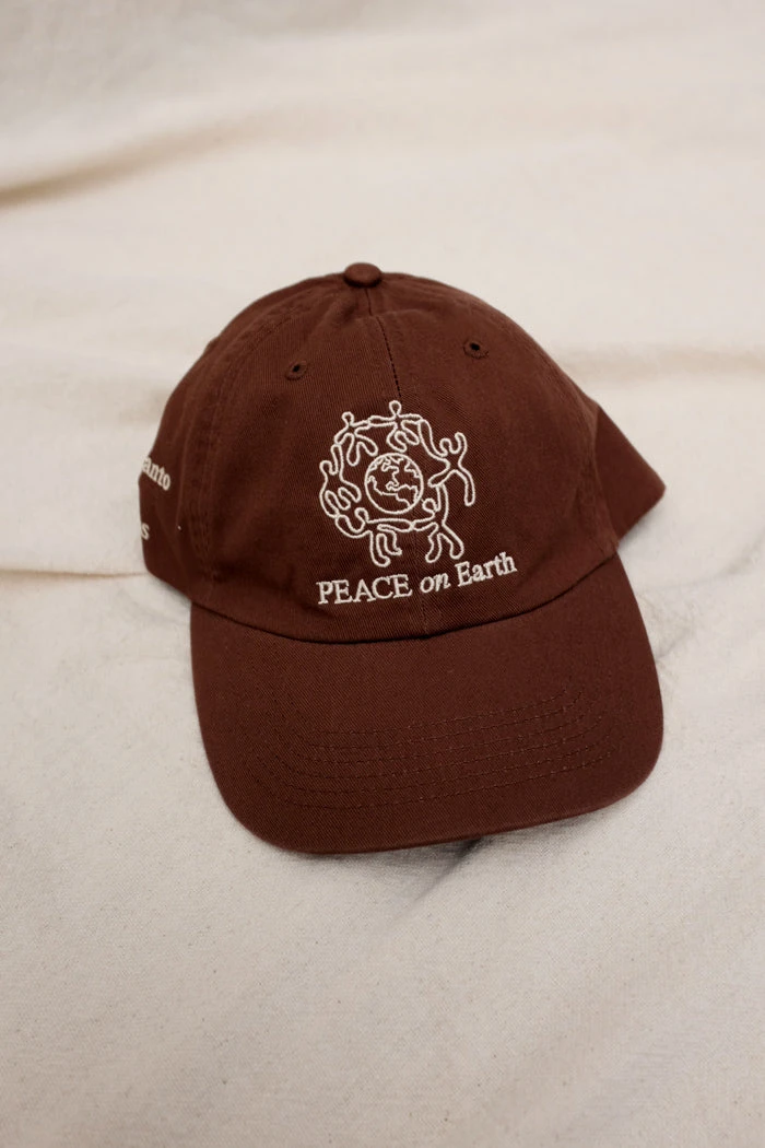 Palo Santo Studio espresso brown hat with white embroidery of peace people.
