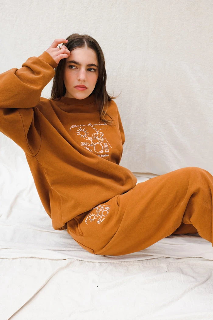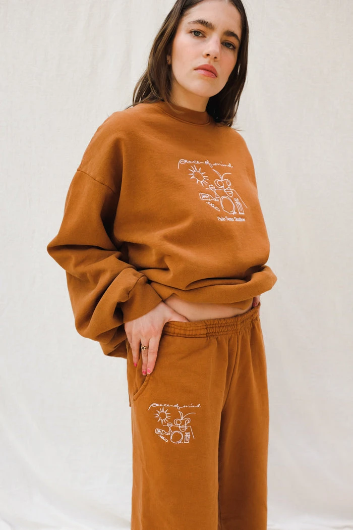Palo Santo Studio Still Life Sweatshirt in terracotta. Oversized classic crewneck in a vintage-inspired garment wash.