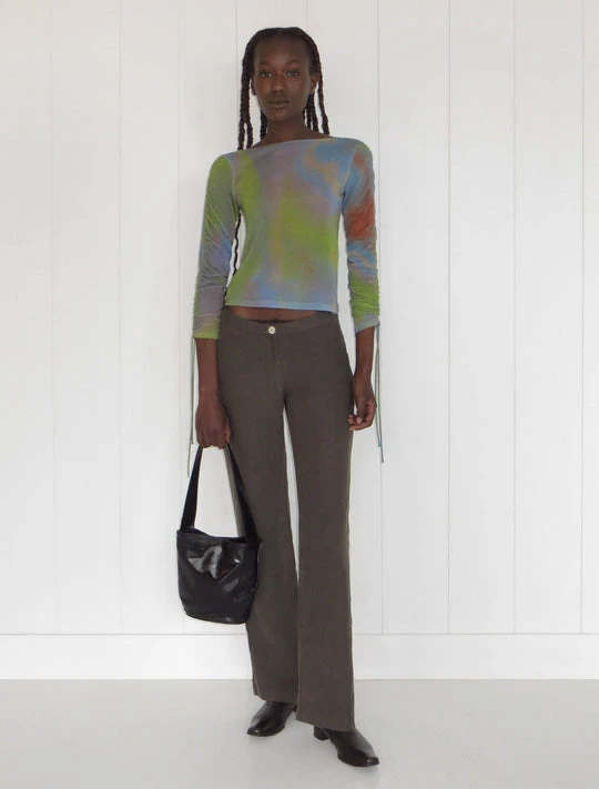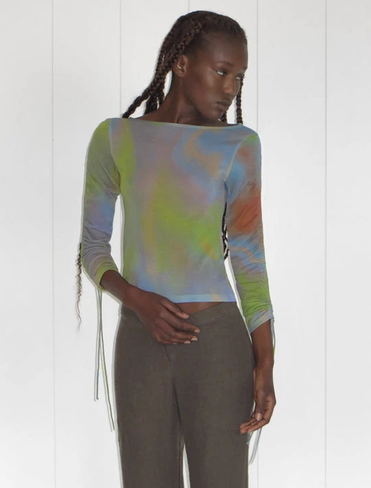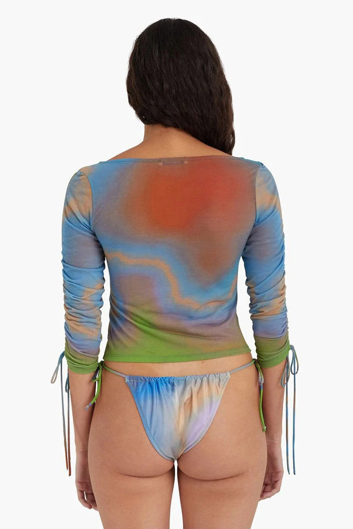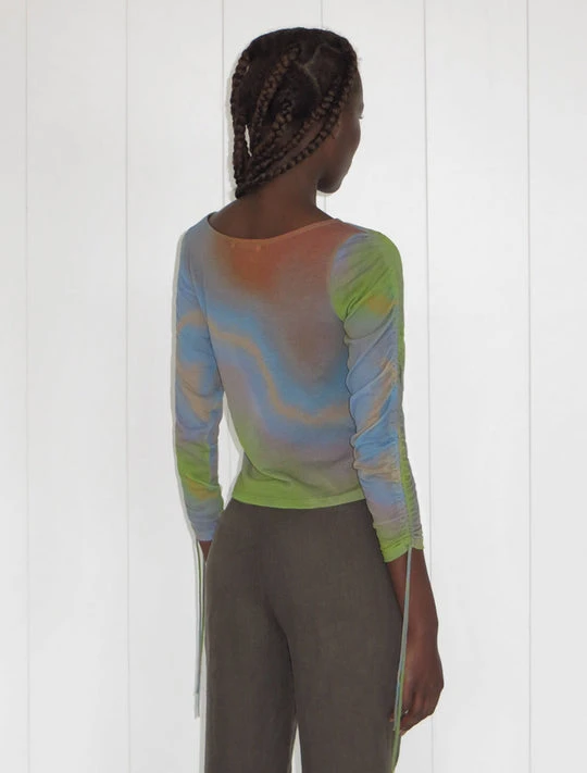 Paloma Wool Shigeko soft long sleeve top with adjustable gathered sleeves, in colorful ombre print. Print by Nika Milano.