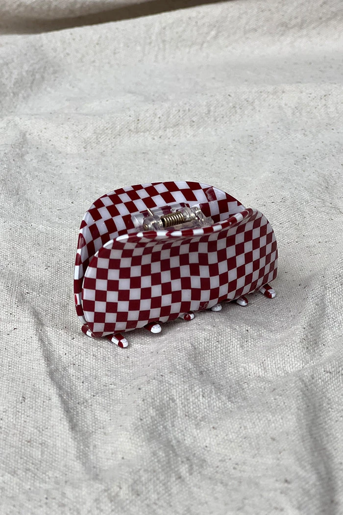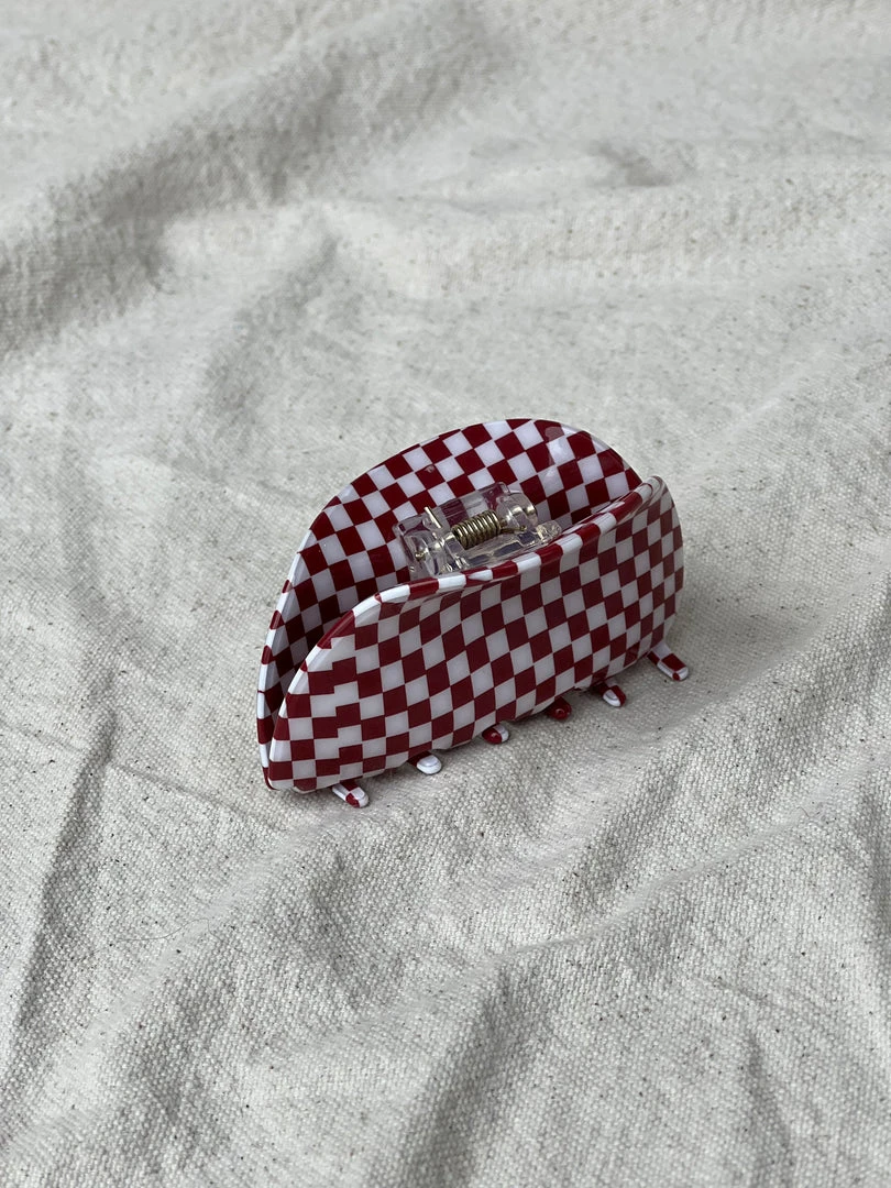 Asymmetrical burgundy and cream checkered resin hair claw.