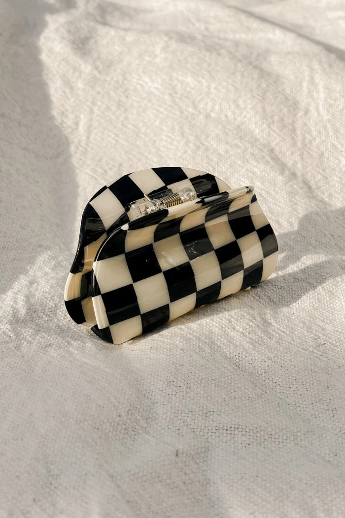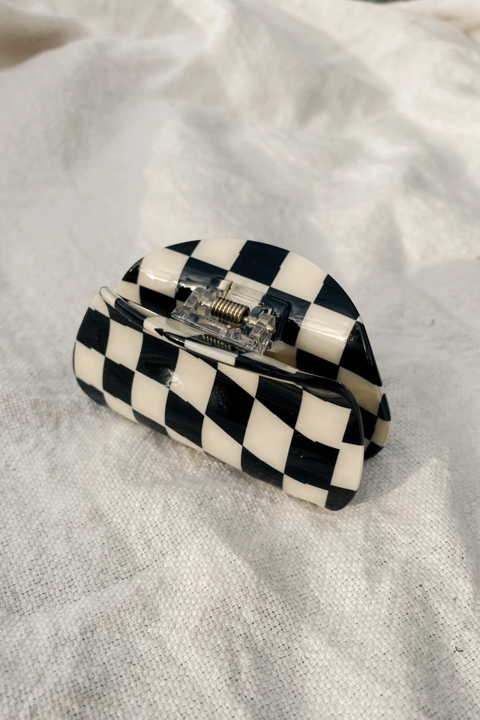 Asymmetrical black and white checkered resin hair claw.