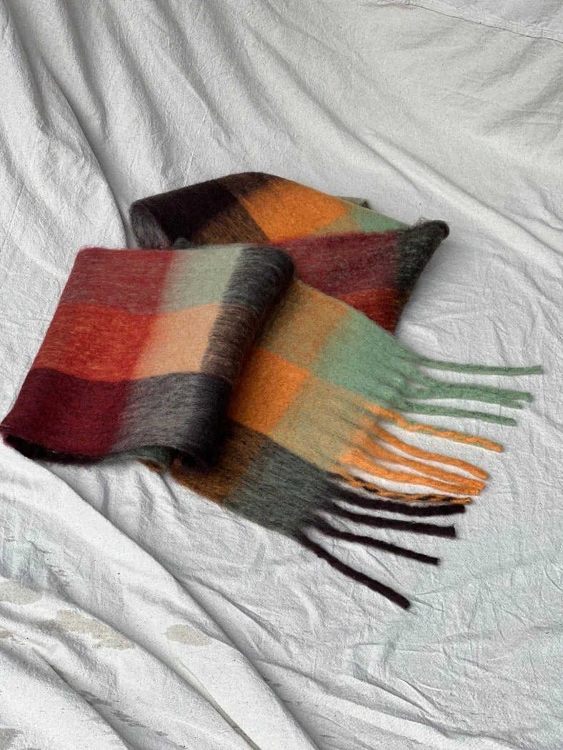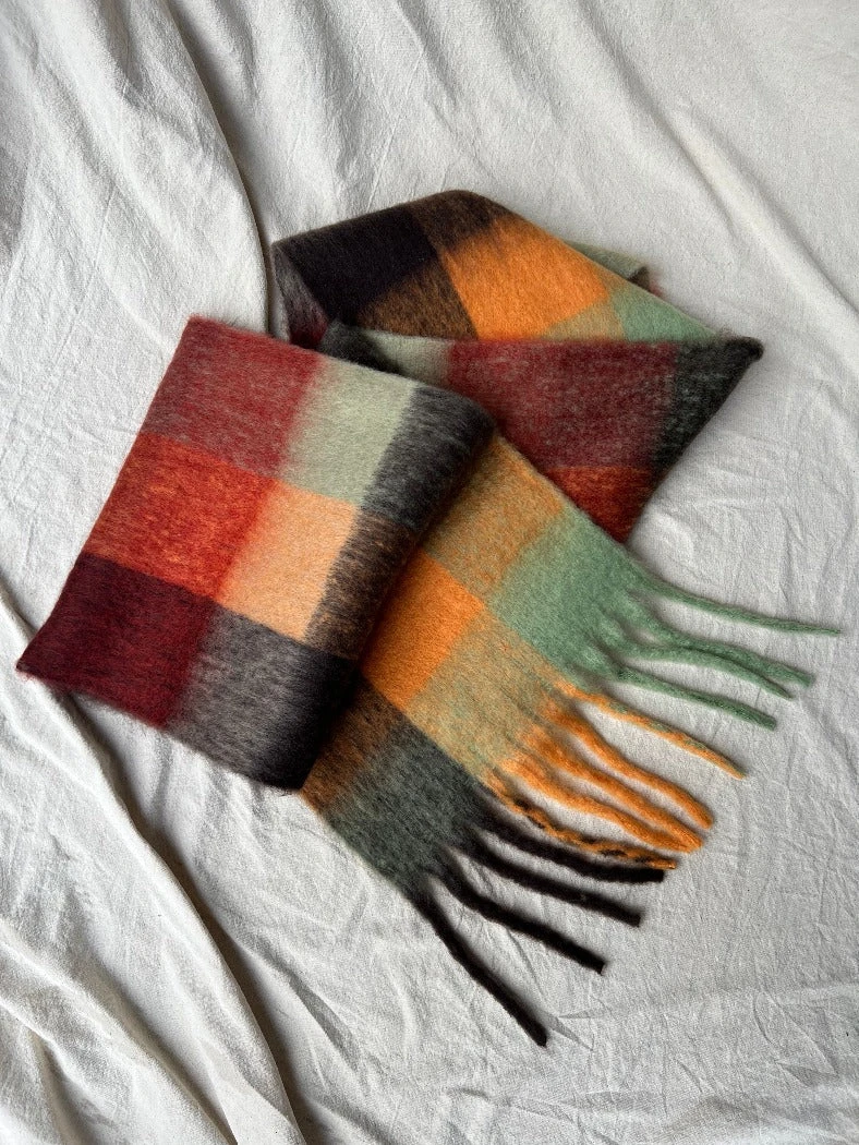 Super soft chunky brown, orange red toned plaid colorful scarf.