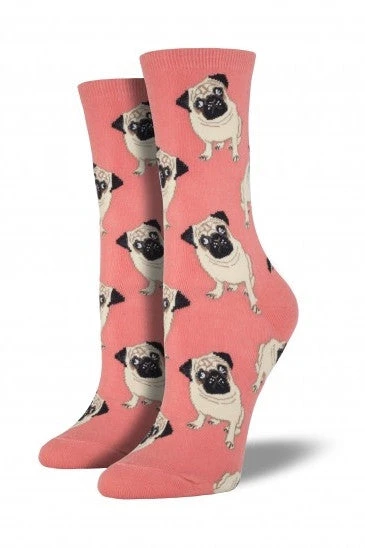 Pipe and Row Staples cute cozy pug socks available in pink, blue and black.