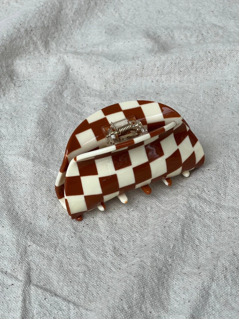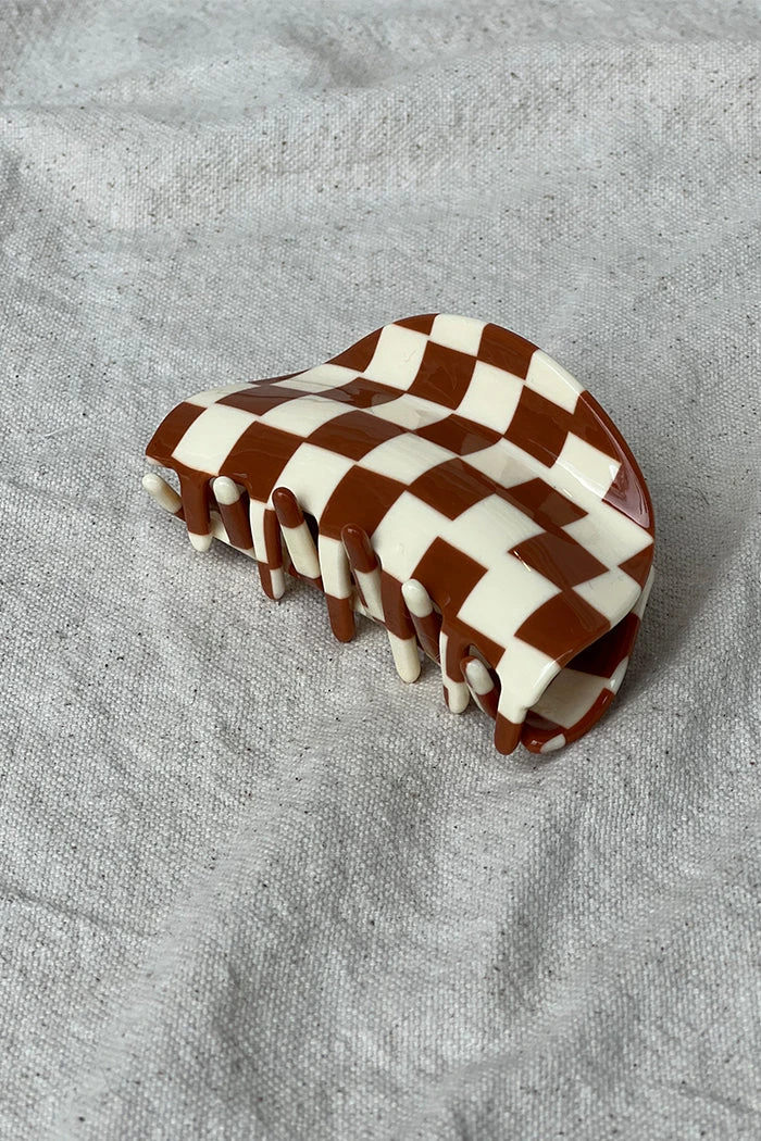 Asymmetrical brown and cream checkered resin hair claw.
