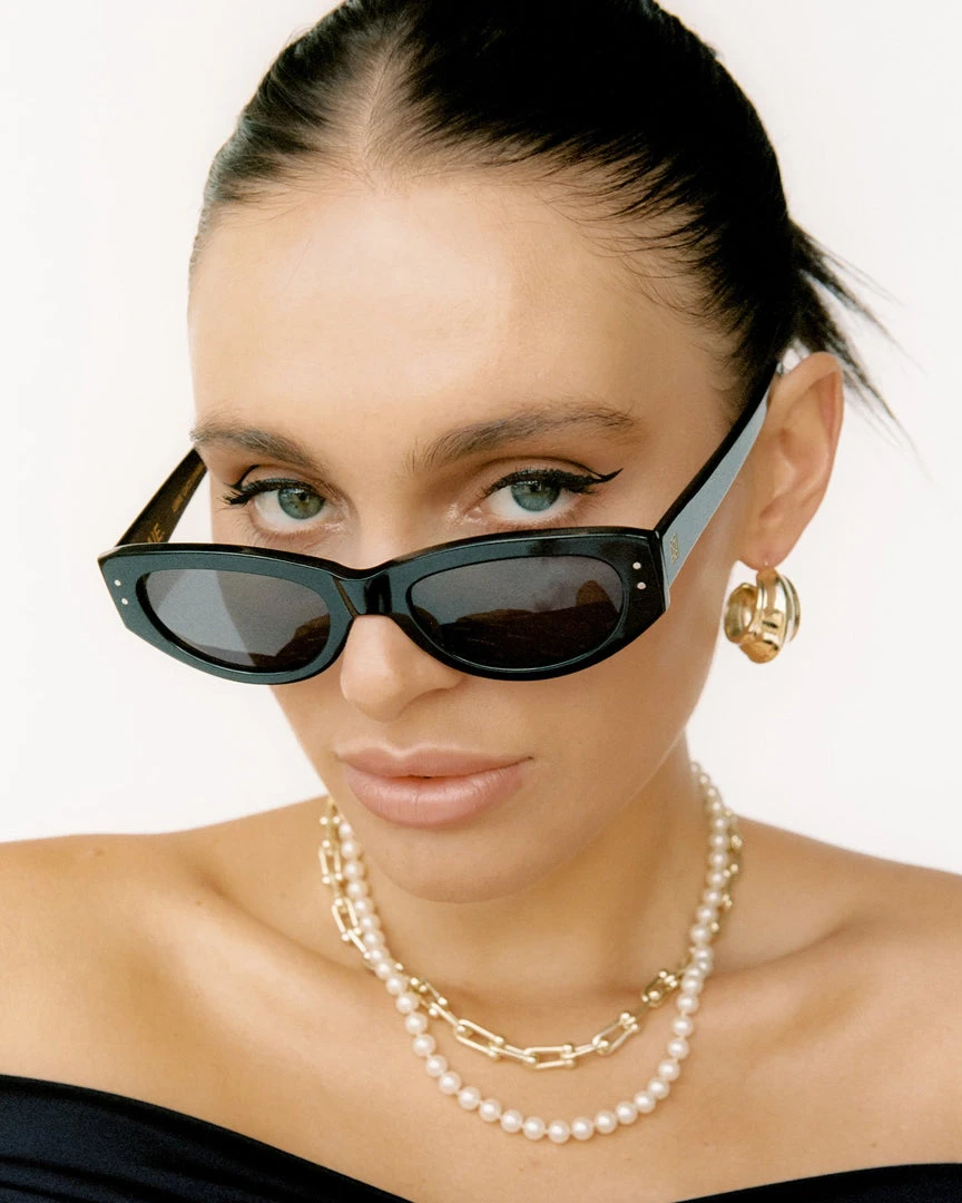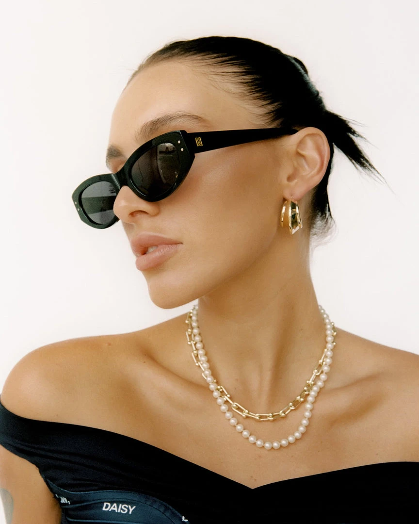 Raie Lakota Sunglasses in black. The unisex oval frame is one of the most modern and durable frames, each pair has signature metal detailing outside the lenses, making him your go to for the street.