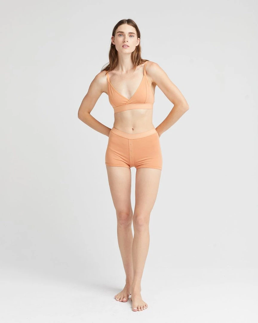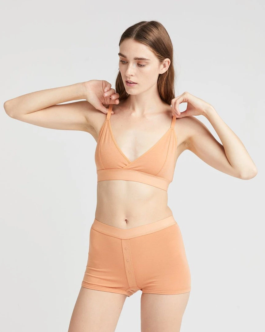 Richer Poorer classic bralette in clay. Minimal coverage, pullover style with wide elastic band. Separate Triangle cups, with darts, unpadded and unstructured. Ultra-soft modal cotton blend. Shrink resistant. Adjustable straps.