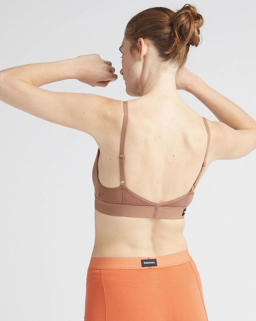 Richer Poorer classic bralette in latte. Minimal coverage, pullover style with wide elastic band.. Separate Triangle cups, with darts, unpadded and unstructured. Ultra-soft modal cotton blend. Shrink resistant. Adjustable straps.