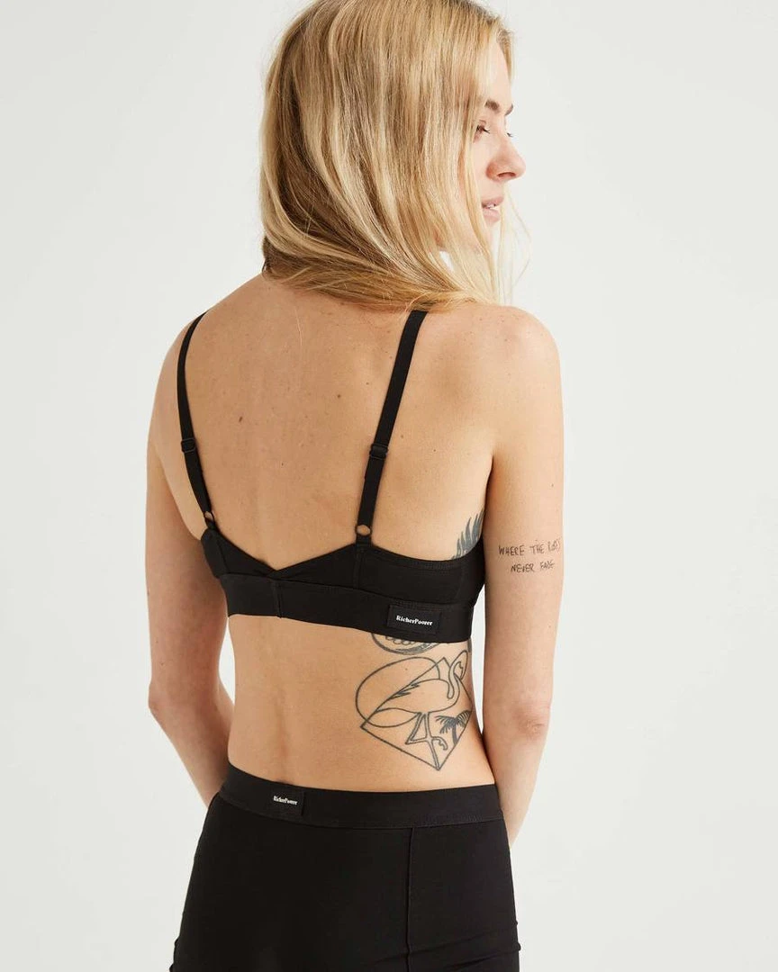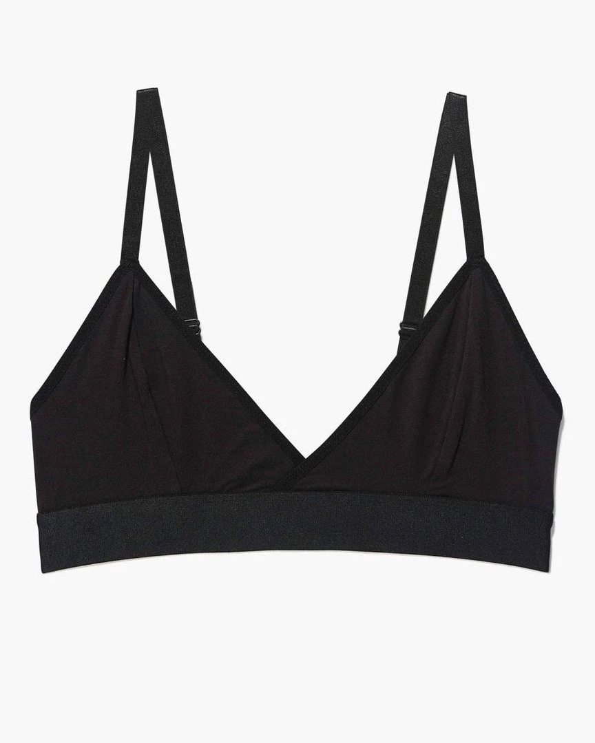 Richer Poorer classic black bralette. Minimal coverage, pullover style with wide elastic band.. Separate Triangle cups, with darts, unpadded and unstructured. Ultra-soft modal cotton blend. Shrink resistant. Adjustable straps.