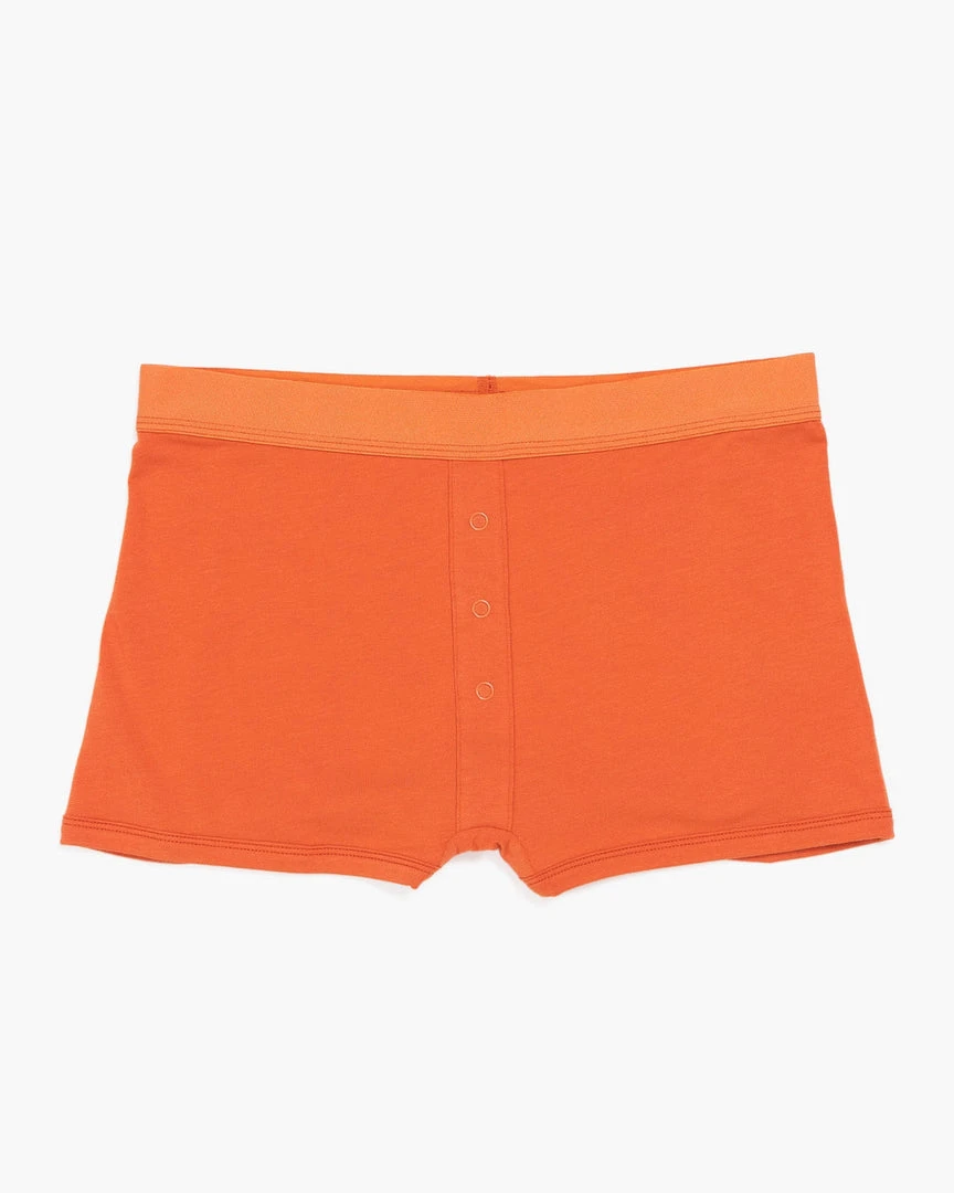 Richer Poorer red orange gingersnap femme boxer briefs. Soft elastic waistband, faux snap detail at front, ultra-soft modal cotton blend, shrink resistant.