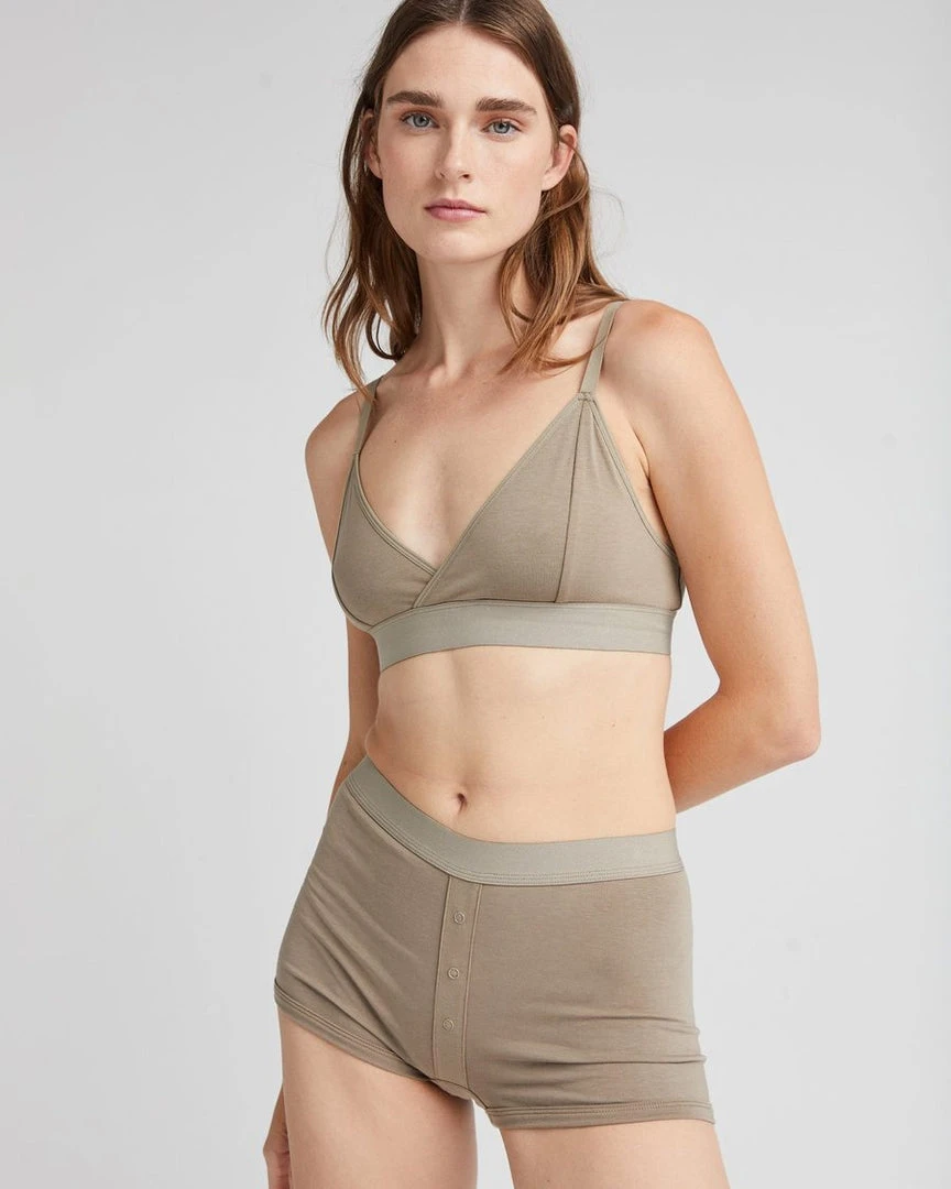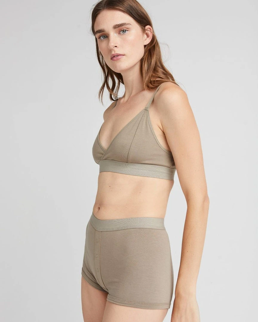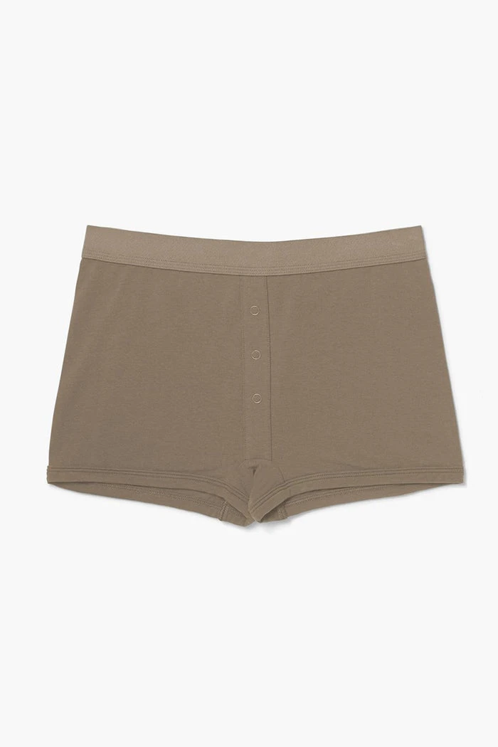 Richer Poorer warm grey brown boxer briefs. Soft elastic waistband, faux snap detail at front, ultra-soft modal cotton blend, shrink resistant.