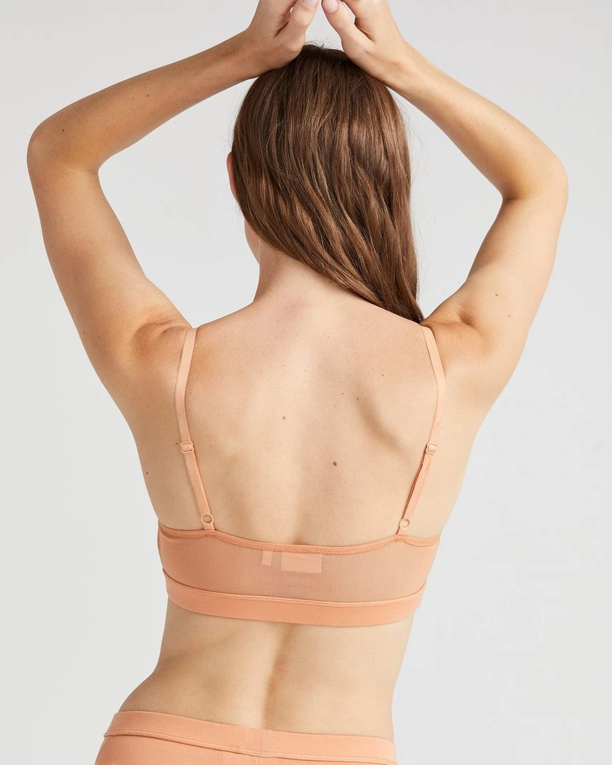 Richer Poorer high cut bralette in clay orange. Modest coverage, pullover style with covered elastic band, separate high apex cups, power mesh detail and adjustable straps.