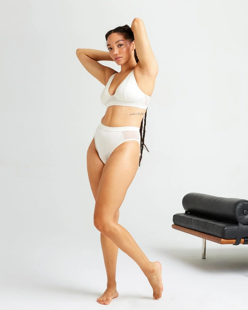 Richer Poorer high cut bralette in bone cream. Modest coverage, pullover style with covered elastic band, separate high apex cups, power mesh detail and adjustable straps.