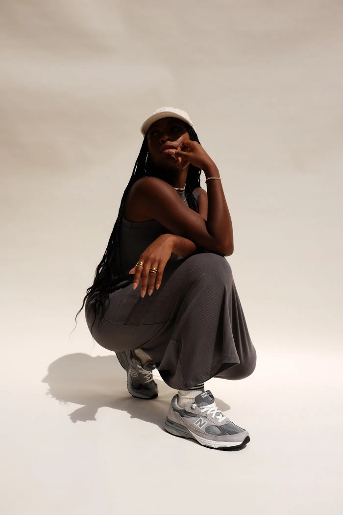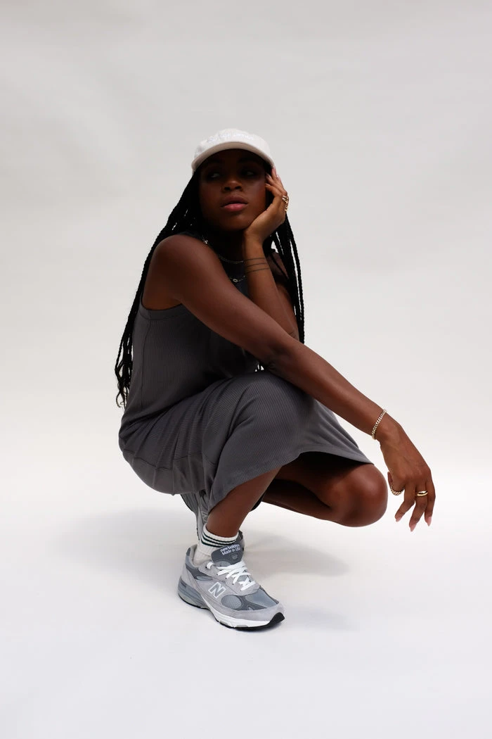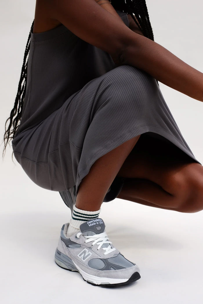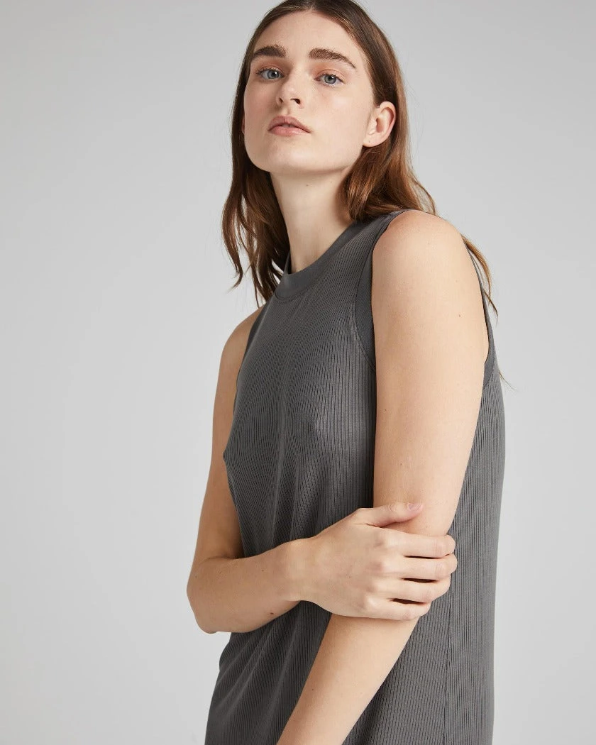 - Richer Poorer vintage column rib maxi dress in gunmetal grey. High neckline, dropped armhole, wide rib trim, ankle length.