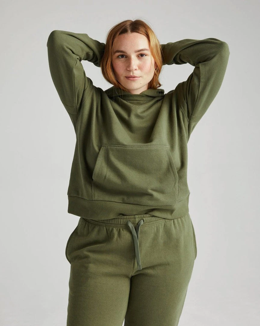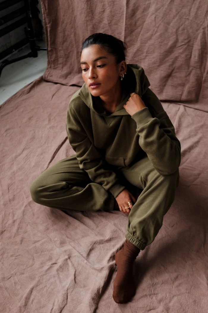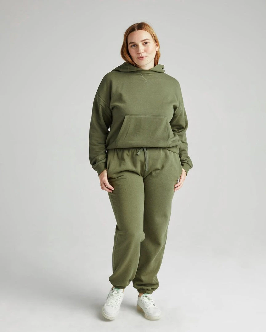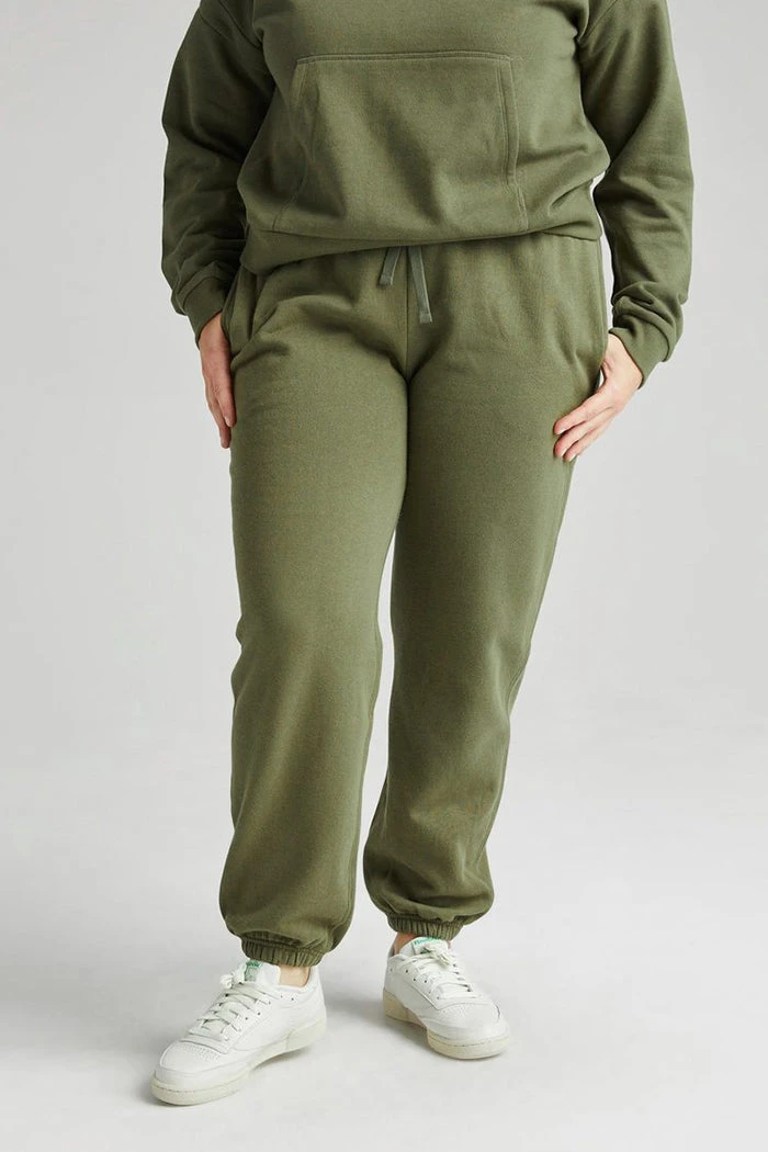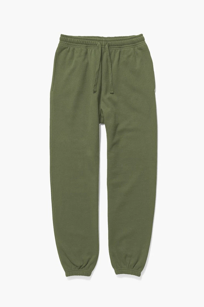 Richer Poorer olive army green, recycled fleece, jogger style sweatpants in super soft—but thick, broken in fabric. Classic fit, encased elastic waist and leg openings, silicone softened for broken-in feel, side seam pockets.