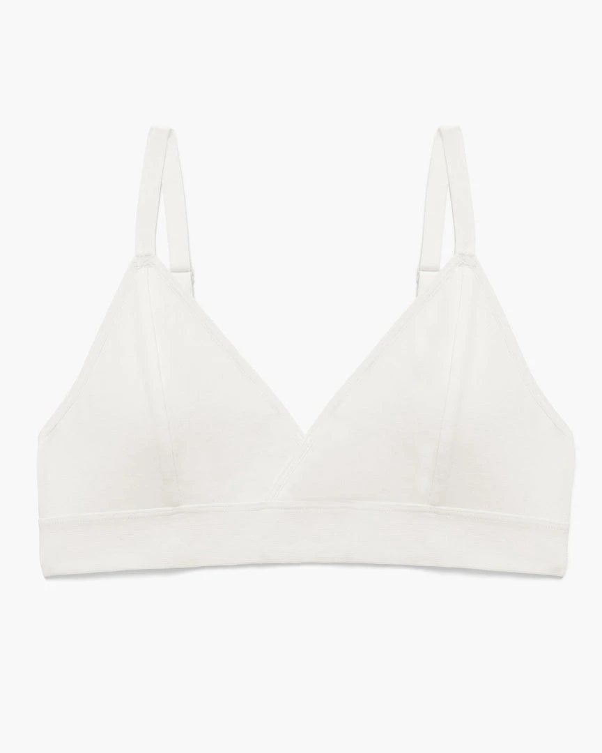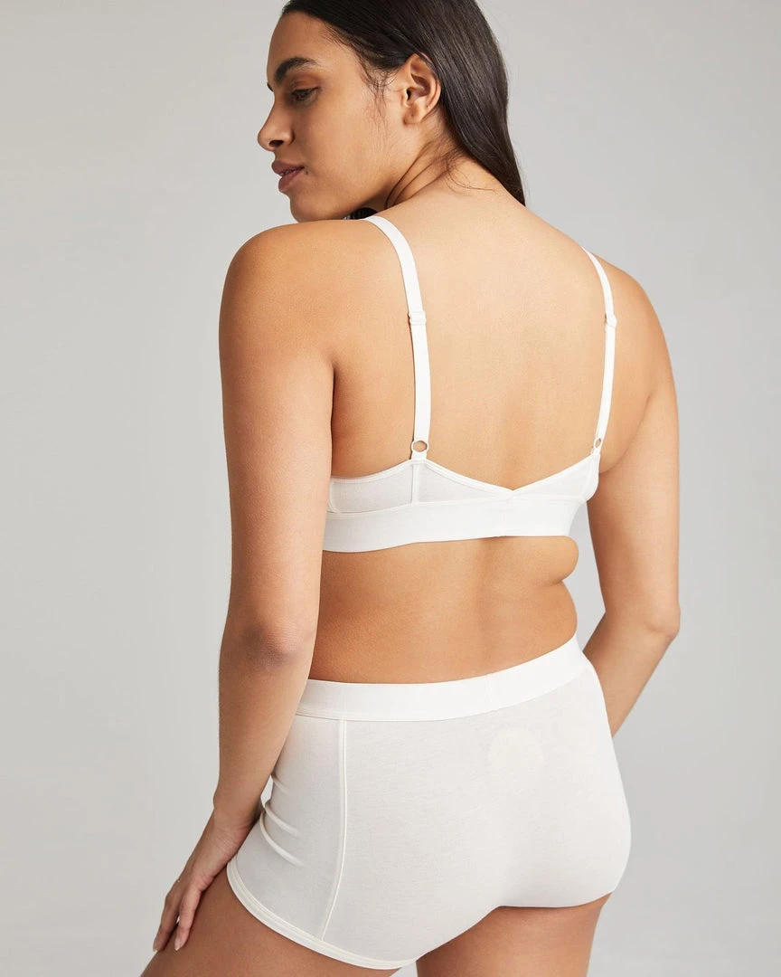 Richer Poorer classic bralette in bone cream. Minimal coverage, pullover style with wide elastic band.. Separate Triangle cups, with darts, unpadded and unstructured. Ultra-soft modal cotton blend. Shrink resistant. Adjustable straps.