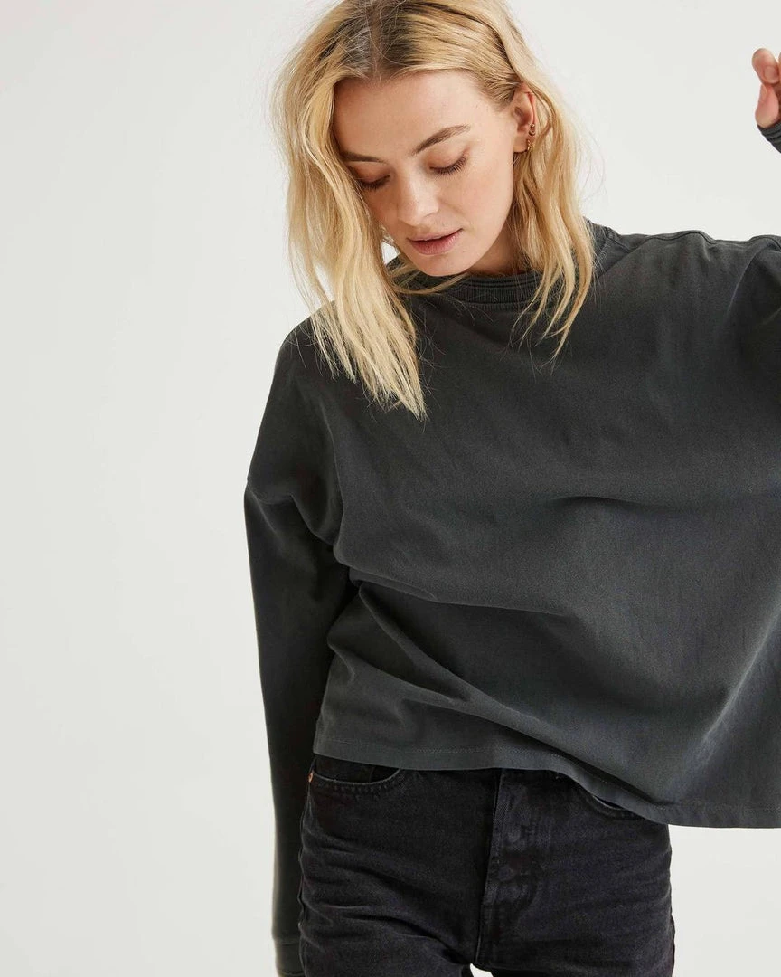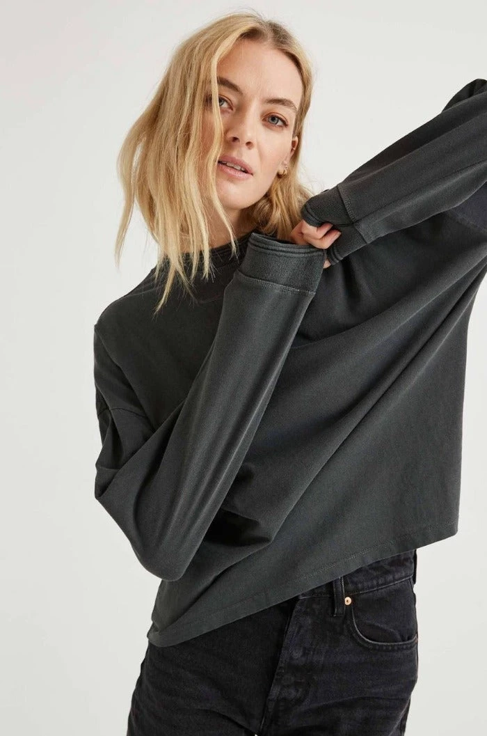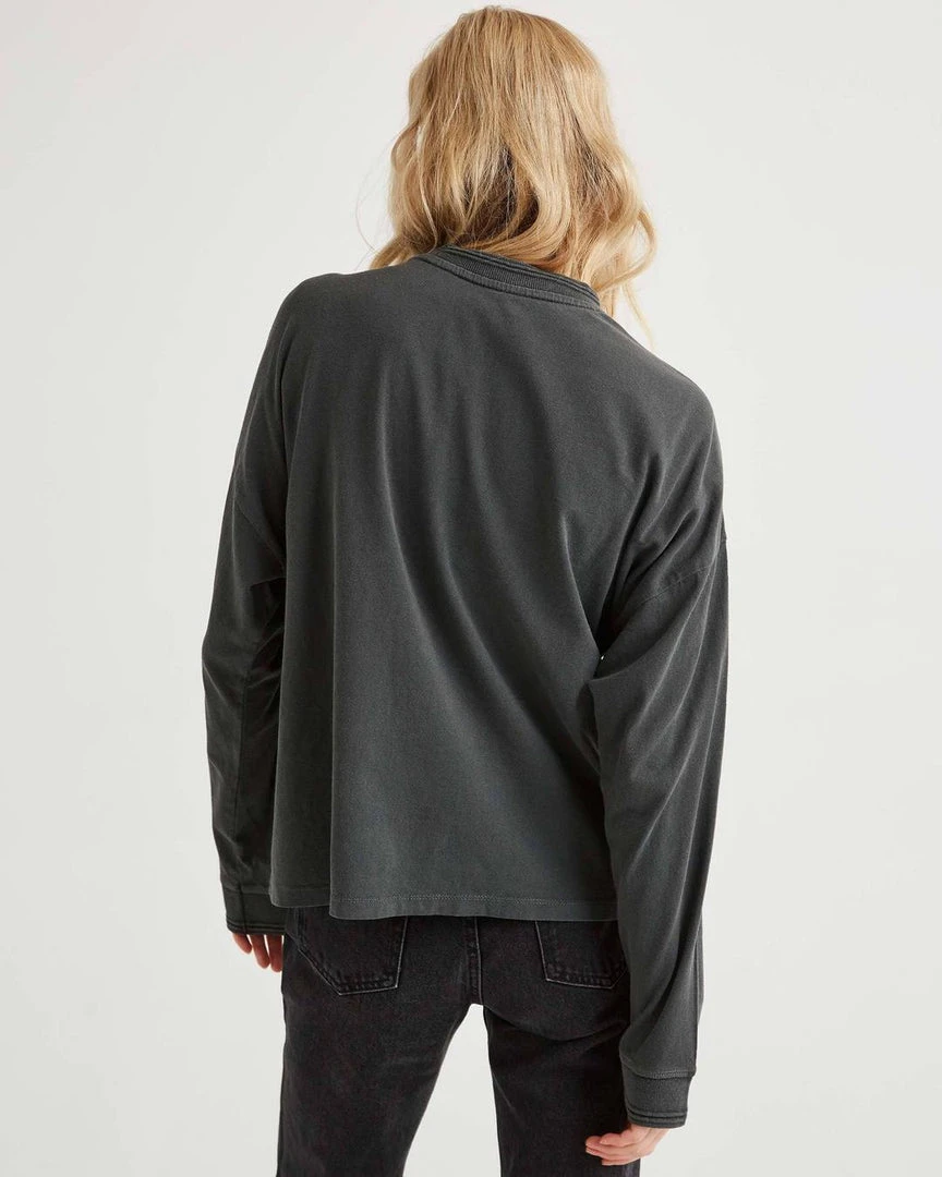 Richer Poorer relaxed thick long sleeve pullover. Pigment dyed, dropped shoulder seam, novelty sweater rib detail and novelty stitching detail.
