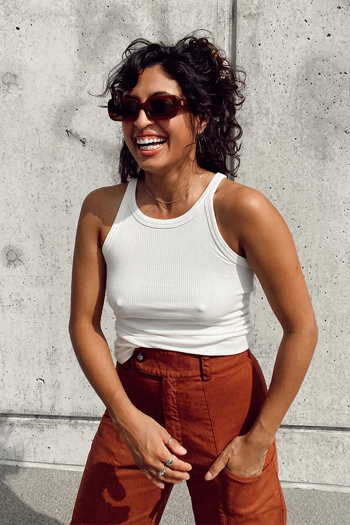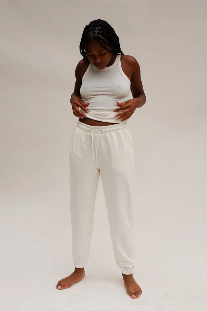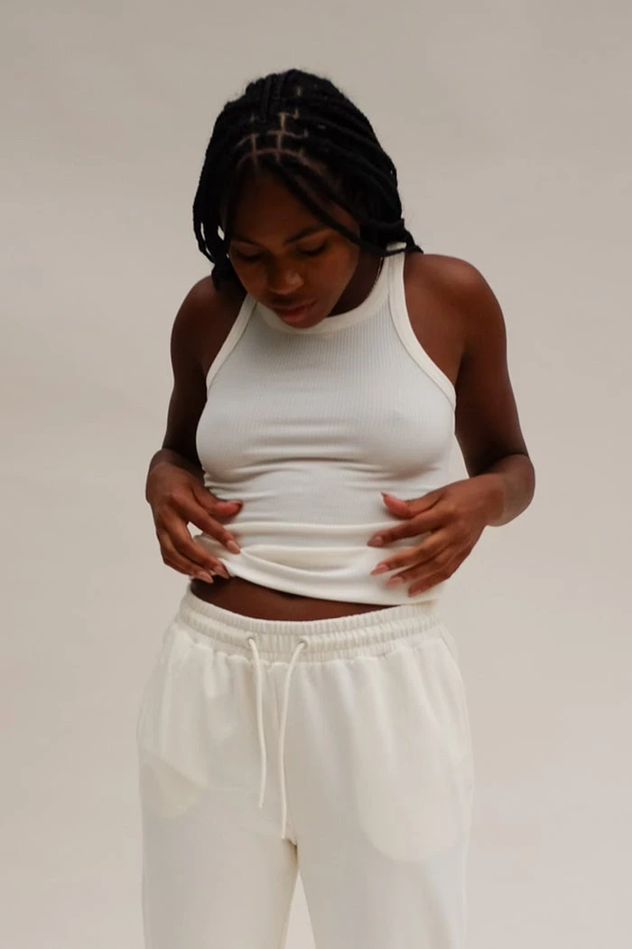 Richer Poorer vintage rib knit racer tank in bone. Slim fit, made from sustainable lyocell, high neckline with slight racer front shape.