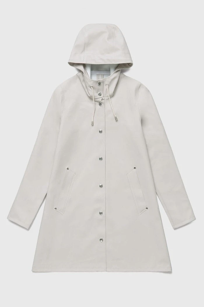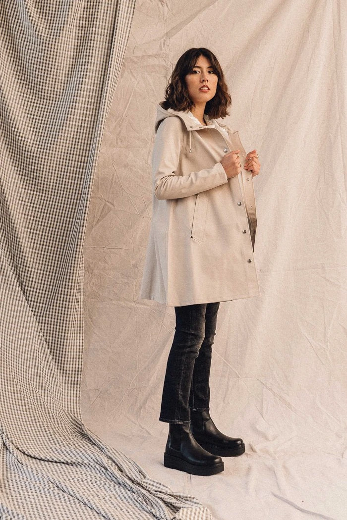 Stutterheim Mosebacke light sand raincoat is the A-line version of Stutterheim’s iconic raincoat. This unisex model has a fashion forward silhouette, with a spacious cut. It is handmade in rubberized cotton, comes unlined and with welded seams. The finest craftsmanship is used to create this beautiful raincoat, here in green with silver buttons and hemp strings. See other colors in the Mosebacke here!Check out the straight Stockholm style here. Mosebacke